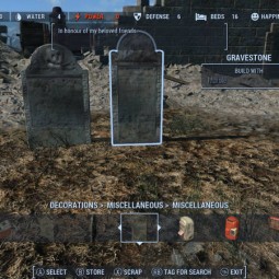 Теперь вы можете избавиться от большинства раздражающих кучек пепла, трупов, скелетов в Ваших поселениях. Большинство животных, гулей или трупов злых врагов дают удобрения, кости и кожу. Минитмены и поселенцы дают вам мрамор, материал для строительства одного из трех типов надгробий. Вы можете найти их в Декорации > Разное.