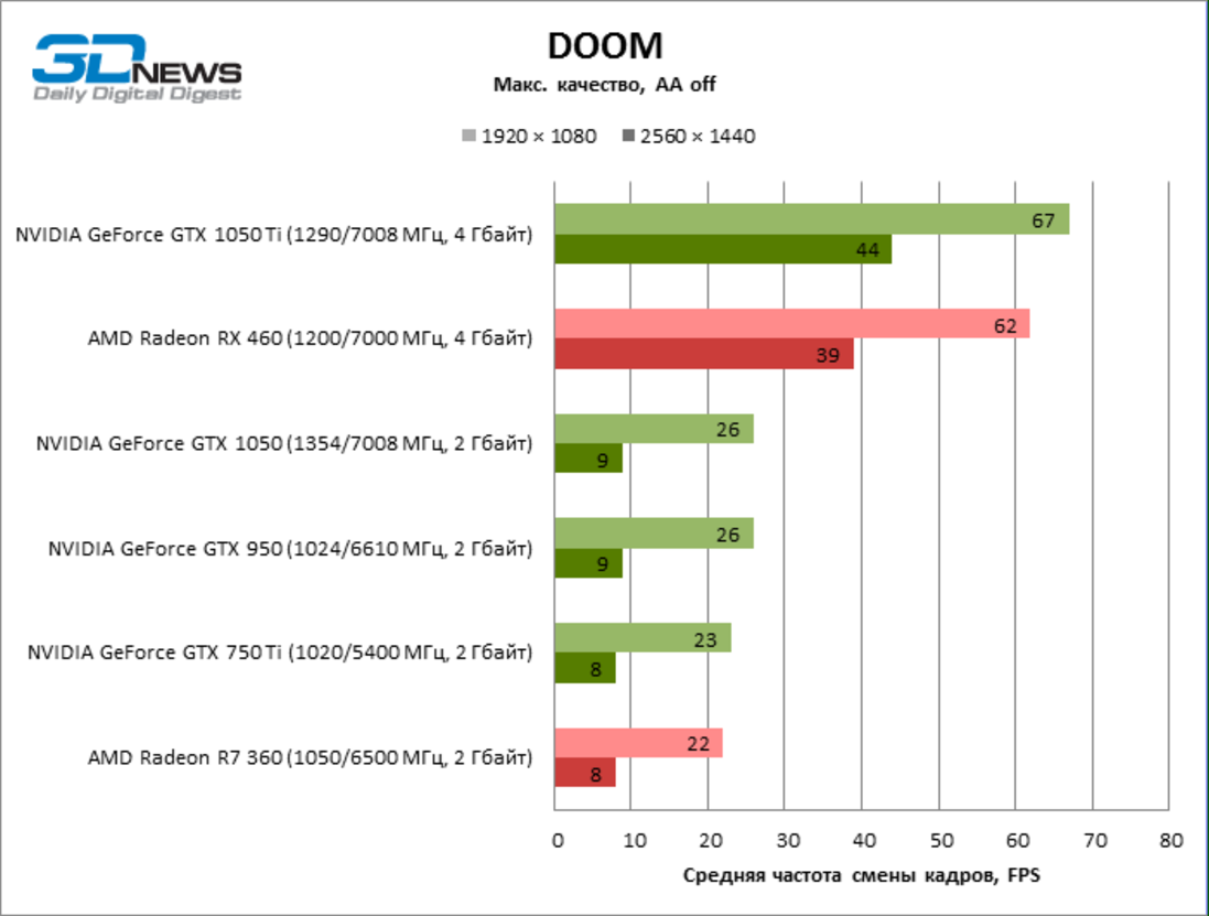 С точки зрения производительности в играх обе рассмотренные видеокарты обладают преимуществом перед версиями Radeon RX 460 с 2 и 4 Гбайт RAM соответственно, и недавнее снижение цен, которое провел конкурент NVIDIA, это довольно наглядно отражает. Однако, как и в случае с Radeon RX 460, объем памяти здесь критически важен. Формально видеокарты такого класса рассчитаны на нетребовательные онлайн-игры, а в играх с развитой графикой требуется снижать настройки, чтобы обеспечить комфортную частоту смены кадров. Тем не менее даже среди современных игр категории ААА некоторым хватает мощности самого чипа GP107 для запуска на высоких настройках и с приемлемым фреймрейтом, а вот 2 Гбайт RAM уже категорически недостаточно. Таким образом, выбор в пользу младшей из новинок позволяет сэкономить $30 (существенная сумма при стоимости устойств в $109/139), но при этом надо отдавать себе отчет в том, что многие возможности даже для бюджетной видеокарты с 2 Гбайт RAM уже закрыты.