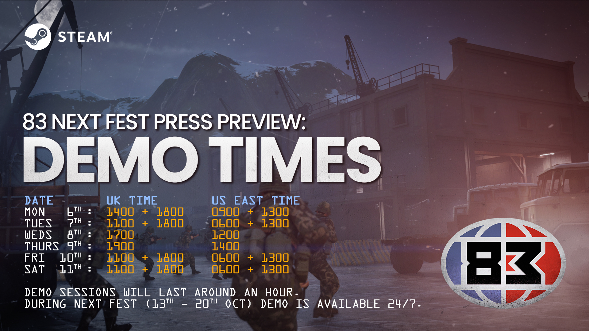 Студия Antimatter Games сообщила, что её командный шутер ‘83, посвящённый альтернативной версии Холодной войны, примет участие в Steam Next Fest, который пройдёт с 13 по 20 октября. Уже сейчас игроки могут опробовать демоверсию, загрузив её со страницы игры в Steam (кнопка «Скачать демо»).