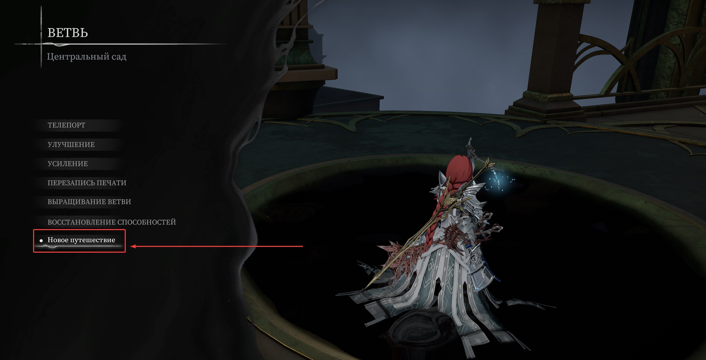 Достаточно загрузить игру и повзаимодействовать с ветвью, после чего нажать на "новое путешействие". Игра начнется заного все боссы будут живы, но при этом все точки телепортации будут утрачены. Все вещи и уровень останутся с вами. Поэтому прокачивать ничего не придется. Идельно, если хотите все сами исследовать. Важно: перед запуском новой игры сходите в локацию "временный лагерь" к роботу. У данного НПС есть асортимент оружия для покупки. Оружие в свою очедь покупаются за ядра которые падают за убийство боссов, поэтому сразу все купить нельзя, так же ядра можно снимать и одевать на своем персонаже. Выберите что-то по вкусу и начинайте новую игры так как после перезапуска новой игры он будет недоступен пока вы его снова не встретите. Еще за ядра можно покупать заклинания у мастера заклинаний Миллэр (девушка блондинка с рожками). Ее тоже нужно повстречать по ходу игры. Основная часть заклинаий была куплена у нее, но несколько за ядра остались некупленными. В сейве ее в лагаре уже нет. В скриншотах есть скрин с указанием месторасположений НПС в лагере, так же куда телепортироваться тоже есть скриншот.
