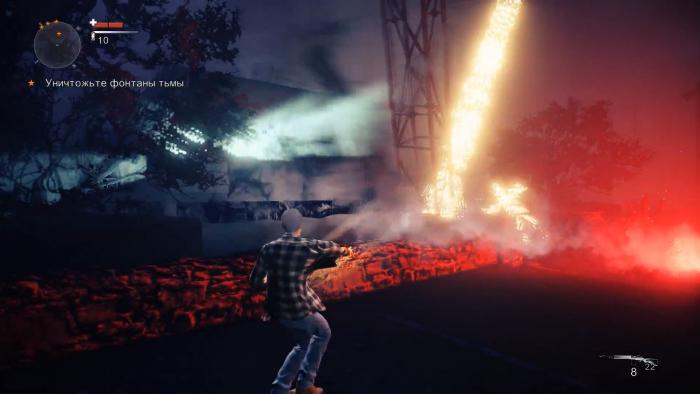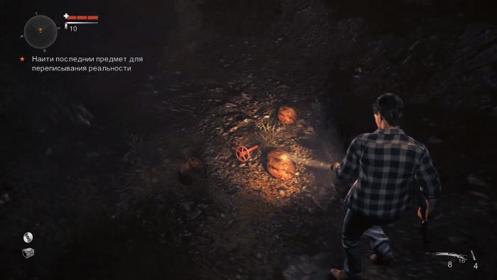 Смотрим начальный ролик. Игра начинается в каком-то каньоне. Алан поднимается с земли, после видения. Игра продолжает события первой части Alan Wake. Силы тьмы закрыли путь прохода. Берем фонарик и идем к дымному явлению. Усиливаем свет фонарика, используя [ПКМ], чтобы сжечь тьму. Идем далее и находим на поддоне пистолет. А вот и появляются первые враги. Оглушаем тьму усиленным светом фонарика и после чего используем пистолет в качестве добивания. После того, как мы одолеем пару врагов, стоит выбираться из каньона.
