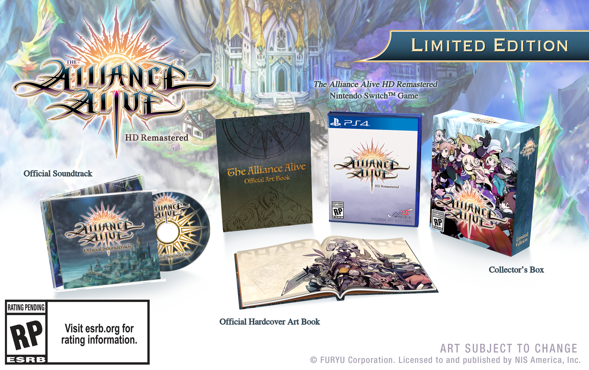 Во время вчерашней трансляции NISA Showcase 2019 компания NIS Ameria представила первый трейлер переиздания японской ролевой игры The Alliance Alive, а также обнародовала подробности западного релиза. Выход The Alliance Alive изначально состоялся для Nintendo 3DS в 2017 году в Японии, в 2018 году игра получила локализацию и вышла на Западе. Обновленная версия под названием The Alliance Alive HD Remastered будет выпущена во всем мире на PlayStation 4, Nintendo Switch и PC осенью 2019 года. В HD-переиздании нас ожидает более совершенная графическая составляющая, а также переработанный интерфейс, так как вместо 2 полноценных экранов теперь будет использоваться один. Вместе с обычным изданием для PlayStation 4 и Nintendo Switch в продажу поступит и ограниченное. В его состав войдут копия самой игры, 9 бумажных кукол, артбук в твердой обложке, официальный саундтрек и красочный коллекционный бокс. На данное издание уже можно оформить предзаказ в магазине NIS America Online Store. Стоимость его составляет 64.99$.