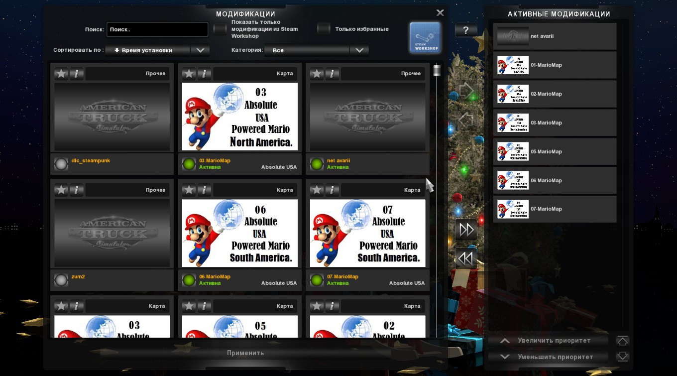 Приятной игры! Я допустил ошибку приношу извинения расположение файлов в менеджере с низу в верх 01-07 Авторские ссылки: http://sharemods.com/ox1qomjxx78k/ATS__Base_ETS2.7z.html http://sharemods.com/6zy0gsqifsc0/ATS_Map_Hawaii_by_Mario.7z.html http://sharemods.com/z7ciw14wah23/ATS_Map_North_America_by_Mario.7z.html http://sharemods.com/4ssn71ojzyub/ATS_Map_South_America_by_Mario.7z.html http://sharemods.com/fs4b0kjqve3b/ATS_Map_South_America_model1.7z.html http://sharemods.com/dfuyyrtd1hxm/ATS_Map_South_America_model2.7z.html