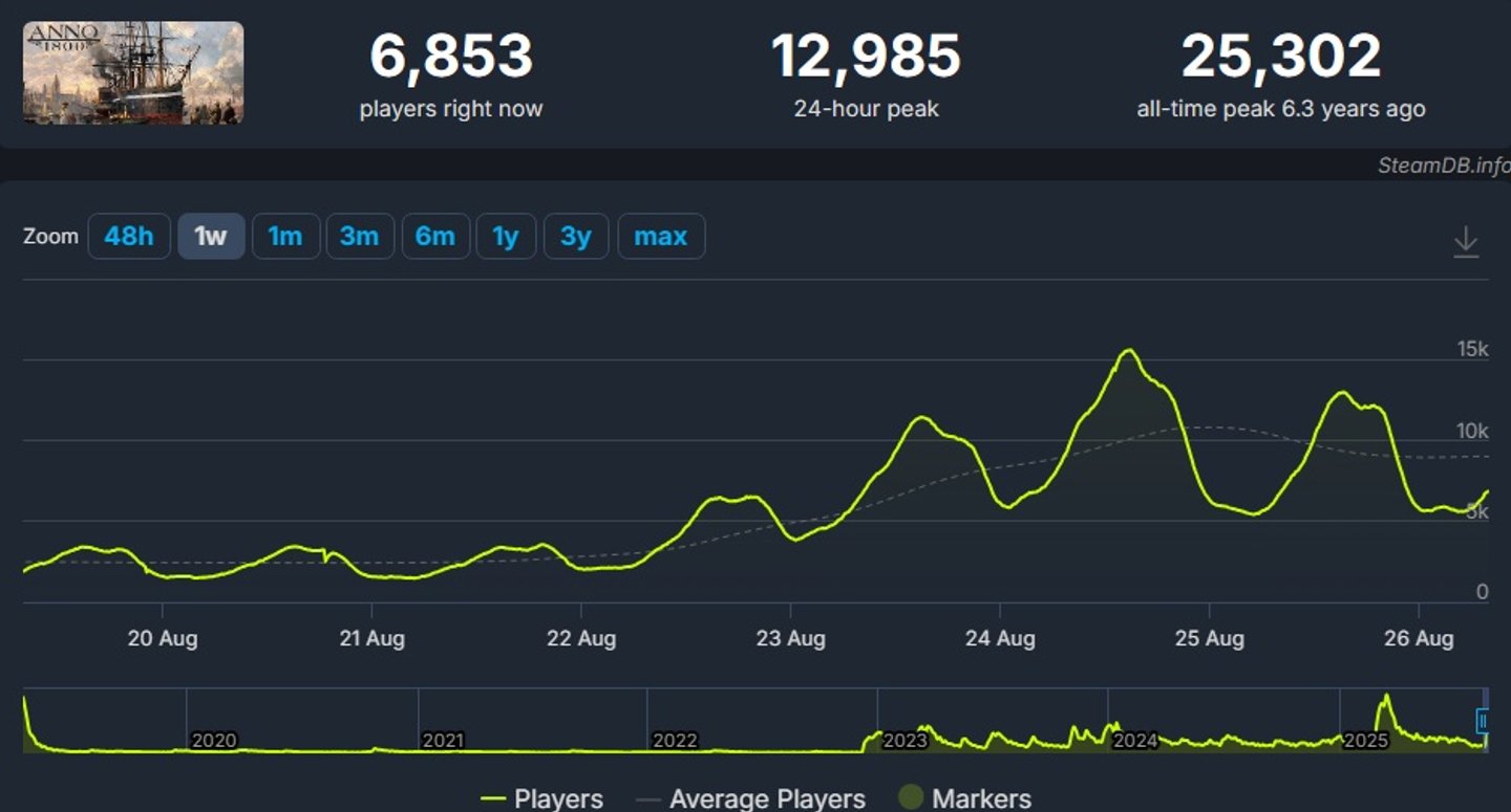 И вот 2 дня назад в игре вдруг резко возросло количество игроков. Как можно заметить по SteamDB, 24 августа Anno 1800 собрала целых 15 тысяч одновременных игроков. Несомненно, это потрясающий и крайне редкий результат для игры, вышедшей 6 лет назад, где обычно количество игроков не превышало 7 тысяч.