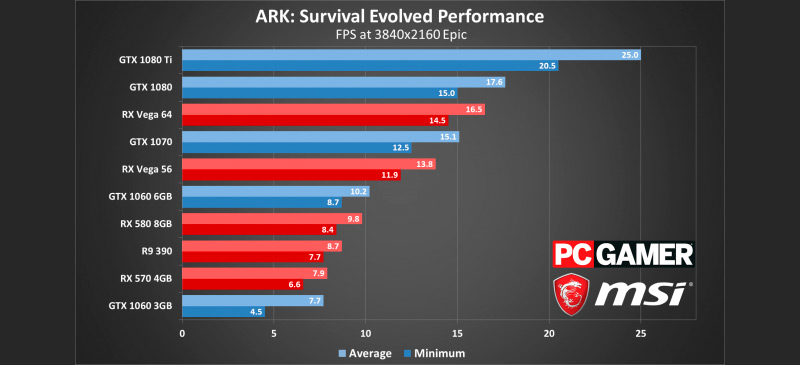 Ресурс PC Gamer протестировал Ark: Survival Evolved на различных PC-конфигурациях — от бюджетных сборок дешевле $100 до настоящих геймерских «монстров» стоимостью более $3 000. И ни одна из них не смогла выдать заветные 60 FPS при 4K-разрешении и максимальных настройках: даже у сборки с GTX 1080 Ti на борту не получилось «выжать» больше 25 кадров в секунду. При выставлении более щадящего Full HD и средних настроек ситуация несколько улучшается: GTX 1080 Ti выдаёт не менее 82 FPS, а вот начиная с карт уровня GTX 1060 или RX 580, добиться 60 FPS уже не представляется возможным. На GTX 1050 или R9 380 даже 30 кадров в секунду — уже достижение. О ещё более слабых картах говорить вообще не приходится.