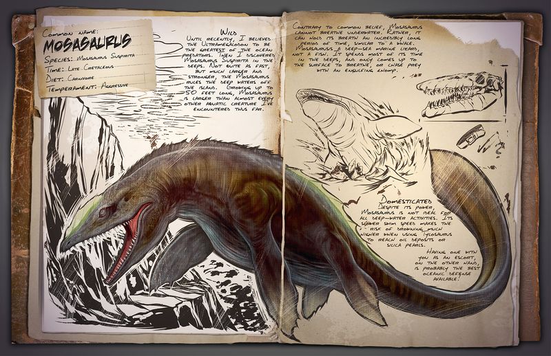 Мозазавр, пожалуй, на данный момент является наиболее крупным и сильным водоплавающим существом, обнаруженным в пределах острова в игре ARK Survival Evolved. Размеры взрослой особи могут достигать 50 футов в длину. Это огромная ящерица, которая не может дышать под водой, но, способна задерживать дыхание на очень длительный период. Ареал обитания – подальше от береговой линии на больших глубинах.
