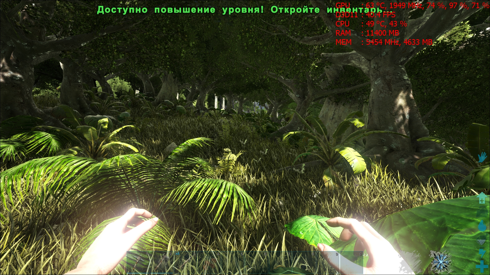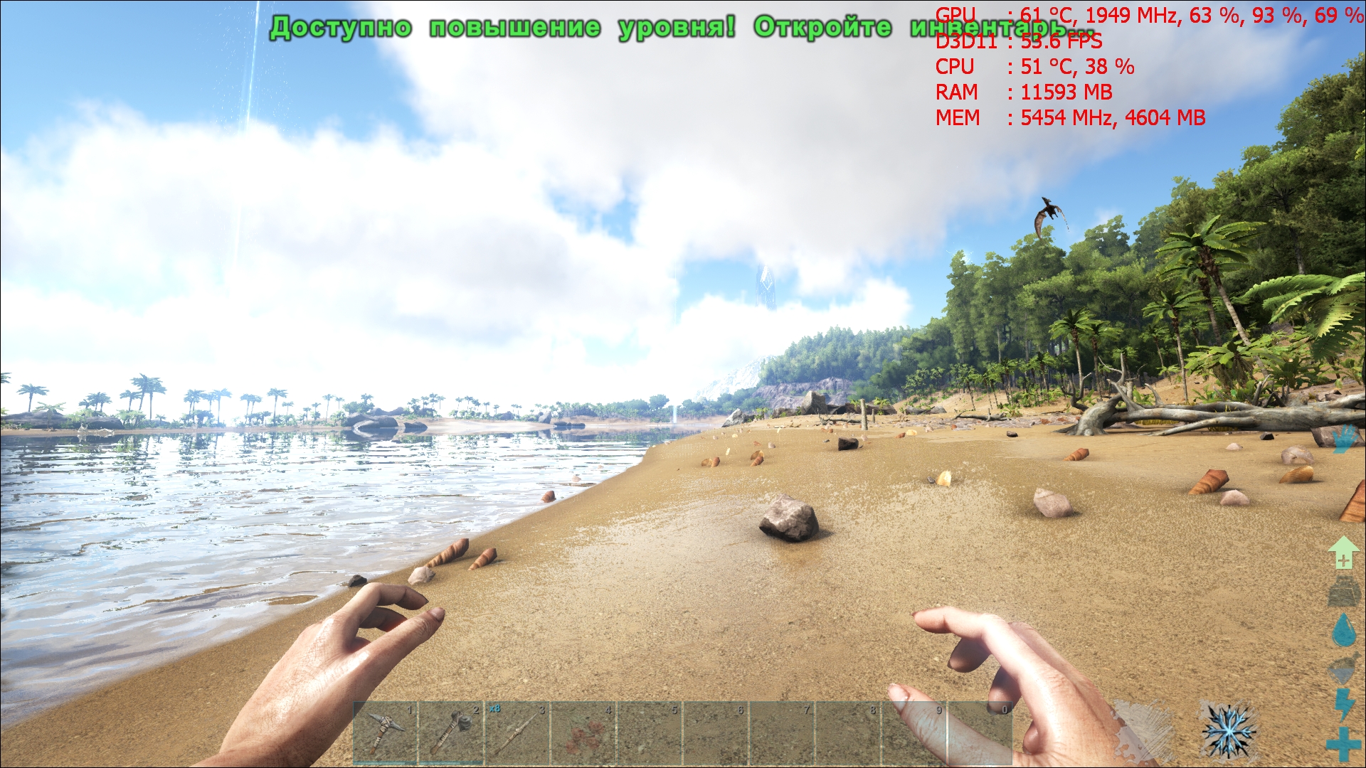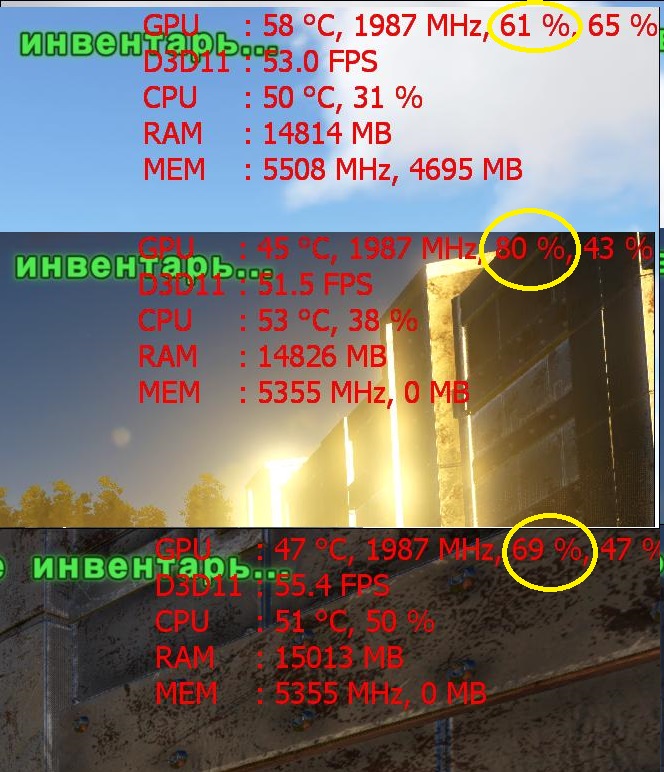 "Вот этого у себя не видел ни на одной из видеокарт." - Просадки наблюдаются с большим количеством дино и постройками. В местности с постройками и живностью, видеокарта просаживается в производительности - загрузка падает до 60-85%, и подскакивает до 98%. Что за? Это что за работа такая видеокарты. Вышел за пределы построек - стабильно 99%.