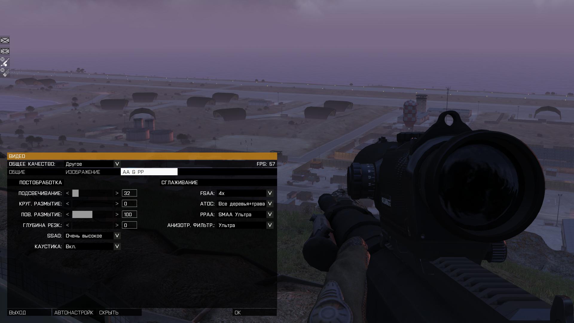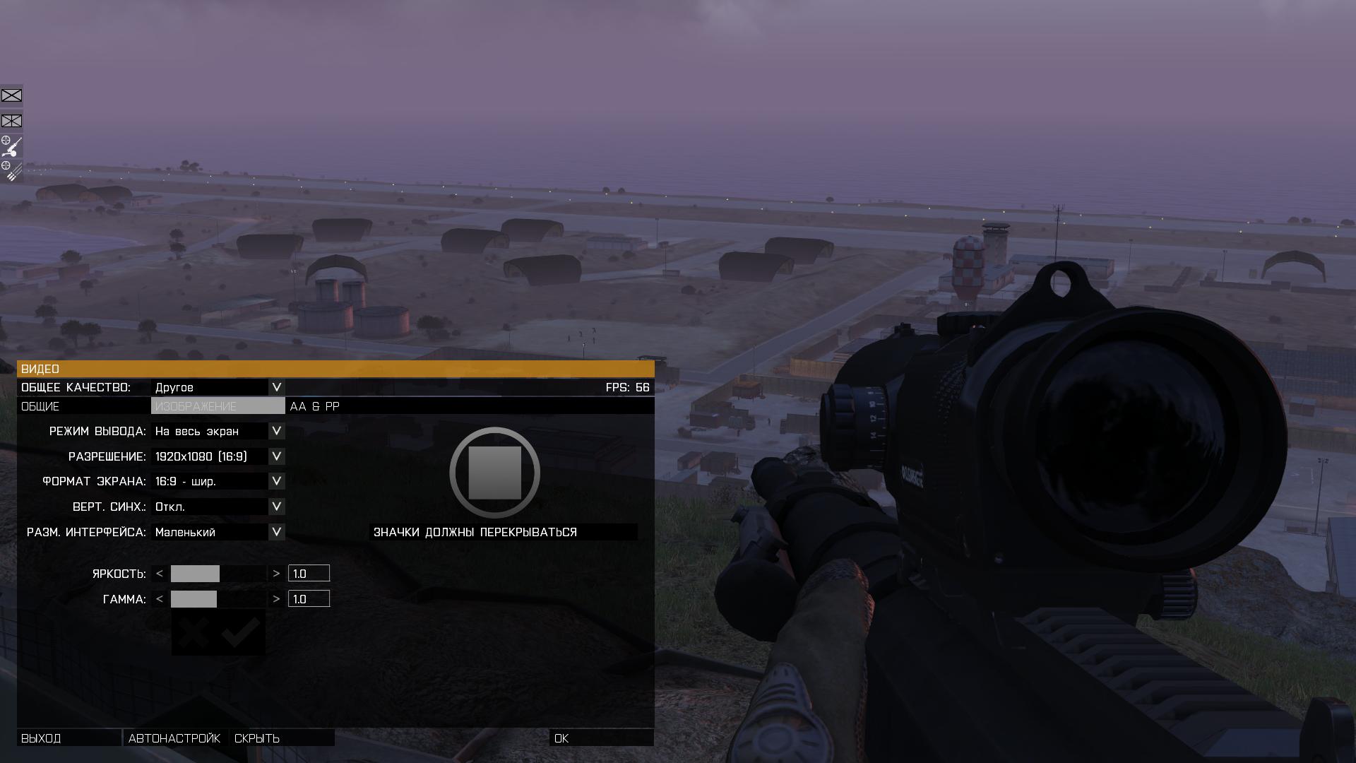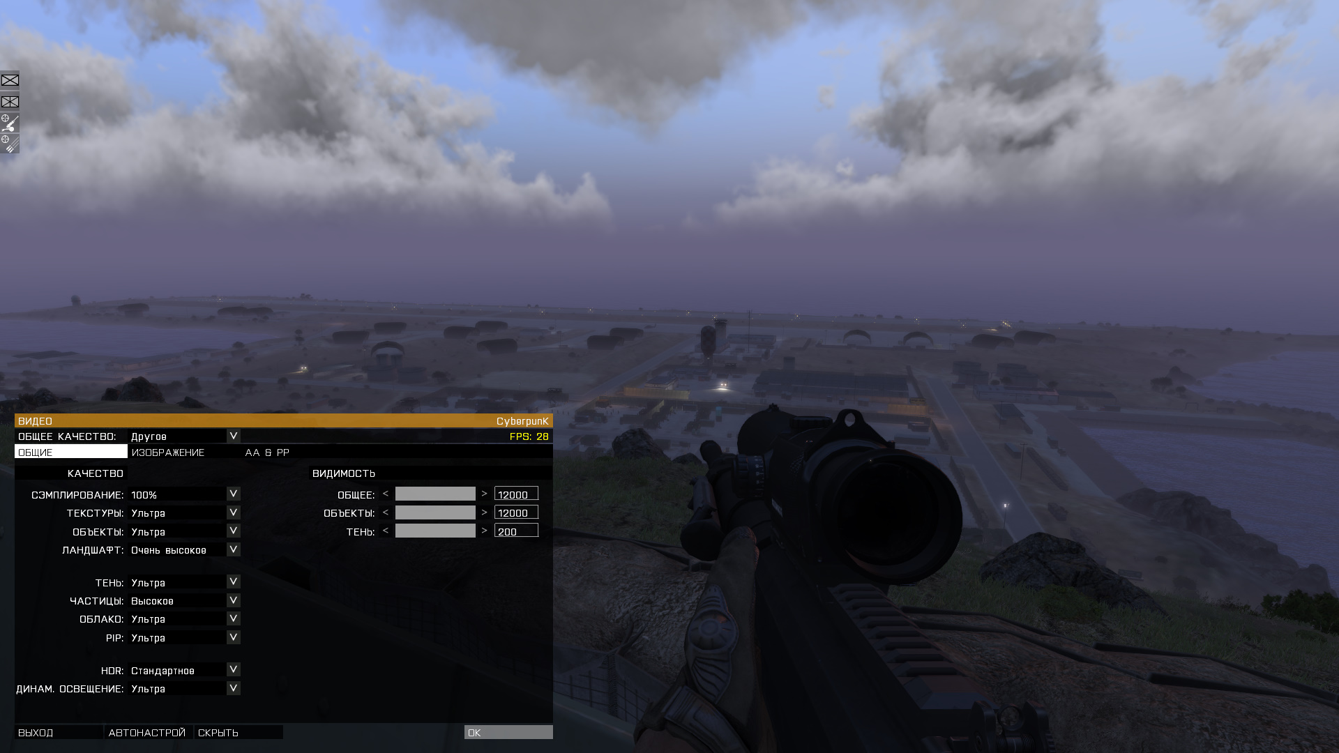 В параметре видимость: пункты общее и объекты выше чем на скриншотах ставить нет смысла, т.к. потом арма начинает очень хорошо кушать наш FPS.