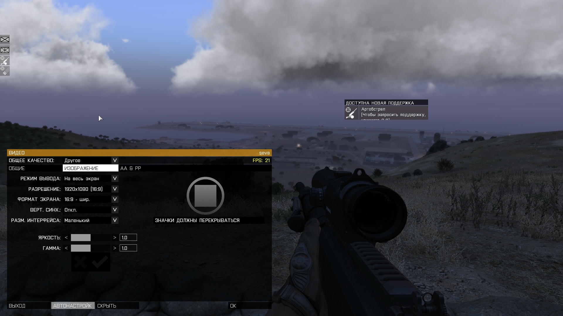 Сделать нужно примерно так. Зайти в "демонстрацию", выбрать "поддержка". Прибежать на "форпост", залезть на крышу и смотреть в сторону базы. Тогда ВСЕ будут в ОДИНАКОВЫХ условиях и вот тогда уже можно будет эксперементировать с настройками и понять, помогло это или нет.