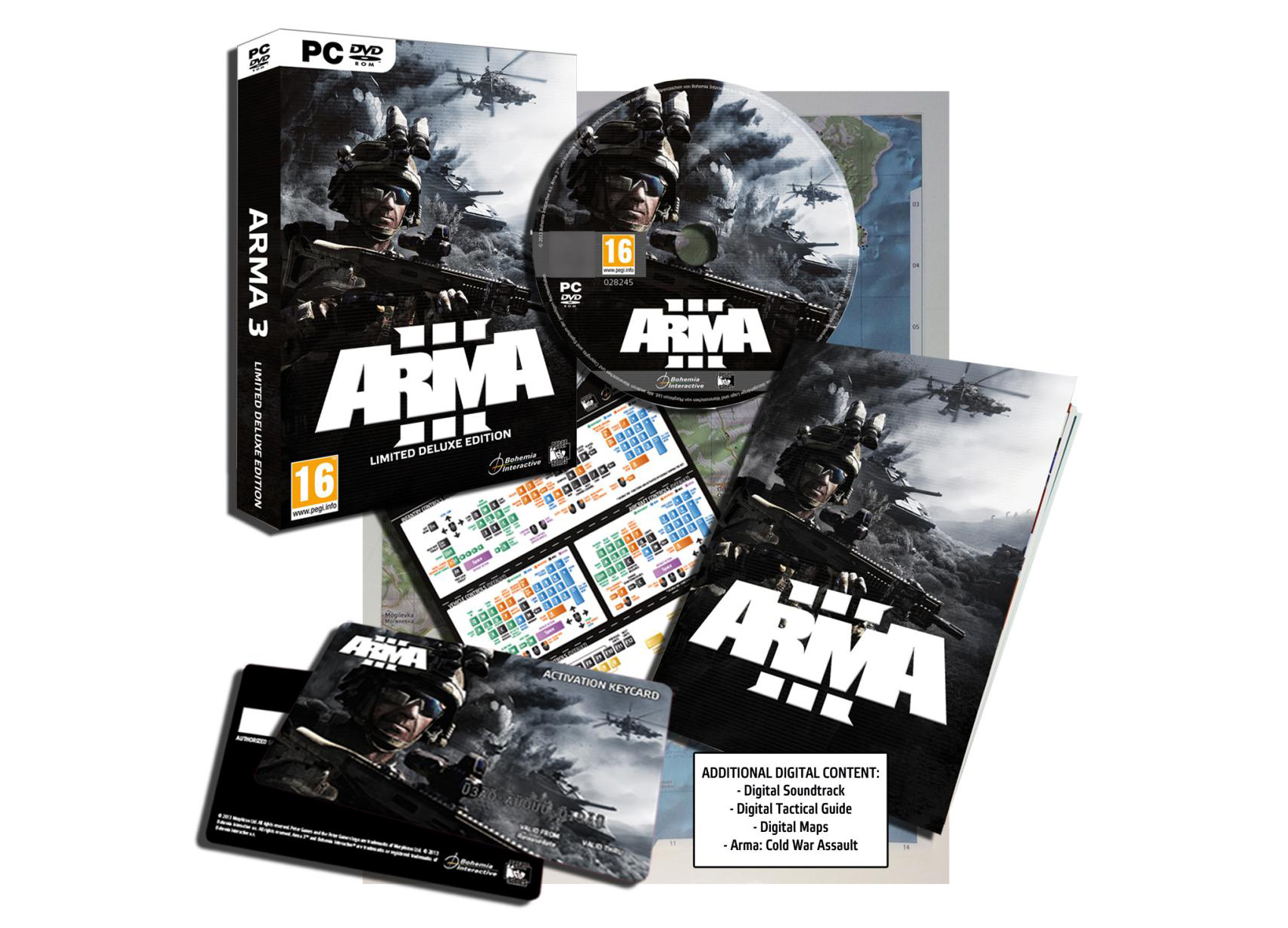 В официальном пресс-релизе от Koch Media говорится, что в состав специального издания нового шутера войдут: диск с игрой, подробная карта острова Альтис, детальная схема расположения клавиш управления, саундтрек, цифровой гайд, цифровые карты и копия Arma: Cold War Assault, в оригинале вышедшей в 2001 году под названием Operation Flashpoint: Cold War Crisis. К сожалению, со стоимостью Deluxe Edition издатель пока не определился. Зато выложил в Сеть два десятка новых скриншотов из текущего варианта игры. Их вы найдете в нашей галерее.