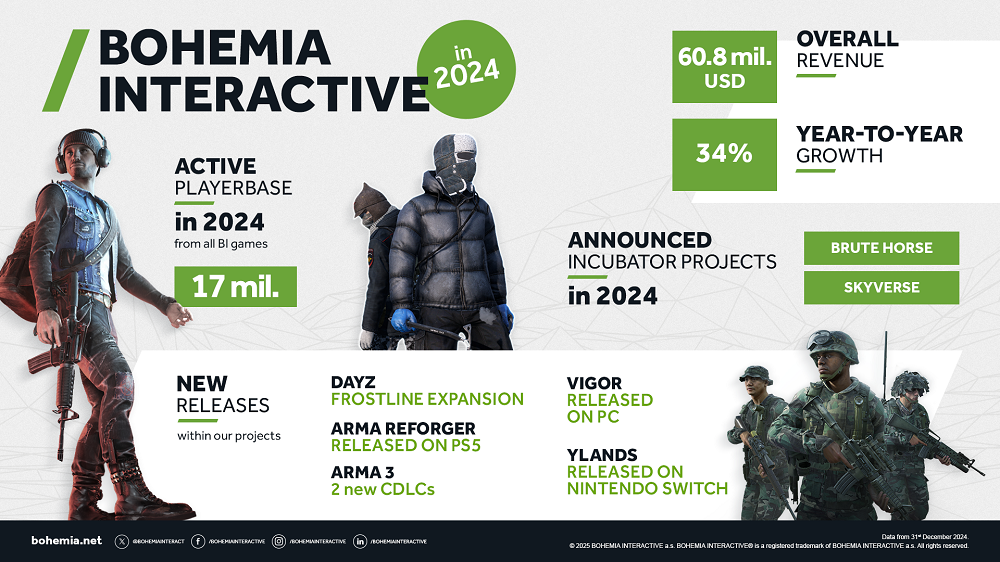 Bohemia Interactive подводит итоги успешного финансового года, за который её выручка увеличилась на 34%, достигнув 57,3 млн долларов. Чешская компания, известная среди прочего благодаря серии Arma, продала 4,85 млн копий своих игр, 42% из которых пришлись на покупателей из США, а общее число уникальных игроков достигло 17 миллионов. В отчетном периоде также зафиксирован выход Arma 4, который запланирован на 2027 год, и продажа 530 000 копий дополнения DayZ Frostline, хоть отзывы о котором были смешанными.