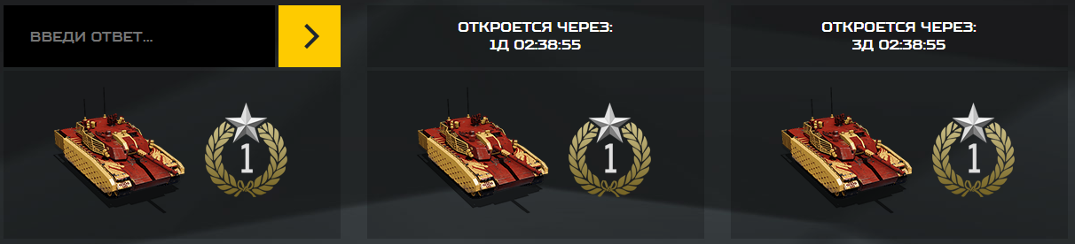 Ну, а для тех, кому этого мало, Проект Армата приготовил и другие подарки. Но для этого простой зайти в игру будет недостаточно. Для того, чтобы получить дополнительные призы придется отгадывать зашифрованные слова, которые необходимо вводить на специальной странице. Вопросы вы найдете там же.Зато награда действительно того стоит.Первый, кто правильно ответит на вопрос получит ЛТ 9-го уровня VT5 Chine, остальные смогут забрать 1 день премиум статуса. Успейте принять участие, время ограничено.