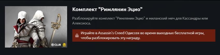 Они давали давеча поиграть 3 дня с 19 по 22 марта, типа надо было в эти дни зайти чтобы получить, но у меня давно уже куплена и полностью пройдено на 100 % вместе с дополнениями. Факт в том что когда вышел патч 1.5.3 с этим костюмом в Uplay было совсем другое условие для открытия этого костюма, посмотри в начале темы искали какие задания сообщества нужно пройти чтобы открыть. А сегодня захожу и бац - уже совсем другие условия для открытия, тем более дней минувших, в общем курвы.