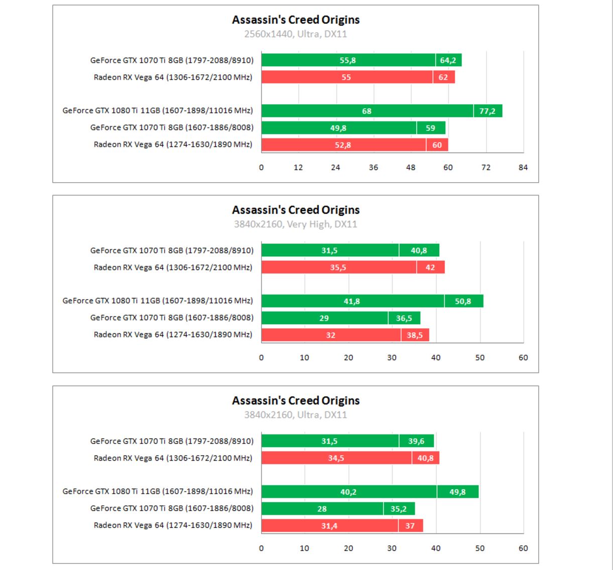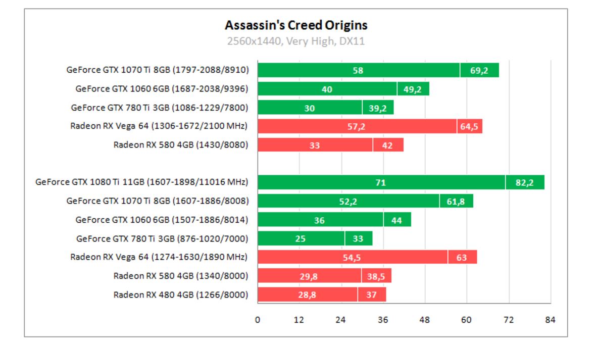 Assassin's Creed Origins — красивая яркая игра, для которой нужны достаточно производительные видеоадаптеры. Стоит отметить важность объема видеопамяти. Для настроек выше среднего уровня нужно 3–4 ГБ, под максимальное качество минимум 4 ГБ. Среди доступных решений хорошо проявит себя GeForce GTX 1050 Ti, с таким ускорителем можно играть при очень высоком качестве графики. Для комфортной производительности в Ultra-режиме нужны более мощные модели. С данной задачей легко справятся GeForce GTX 1060 и Radeon RX 580. Radeon RX Vega 64 и GeForce GTX 1070 Ti позволяют нормально играть вплоть до разрешения 2560x1440. Если вы решили замахнуться на 4K, то потребуется GeForce GTX 1080 Ti.