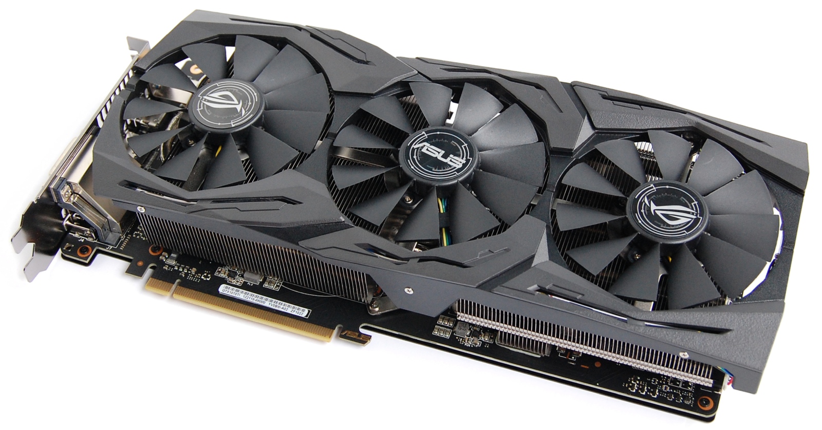 Далее идет видеокарта ASUS ROG Strix GeForce GTX 1070 Ti Advanced edition, которая по частотным характеристикам идентичная другим моделям этой серии. Подробнее о возможностях охлаждения и разгоне ASUS вы узнаете из соответствующего обзора.