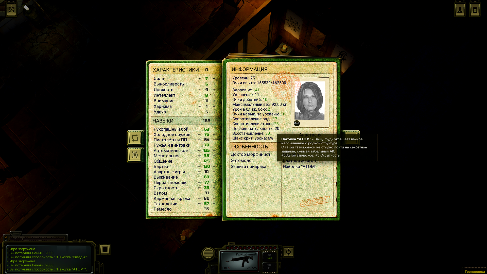 Кстати на базе вахтовиков можно поднять ловкость на 1 единицу если поучаствовать в конкурсе татуировок,наколоть харм с куполами и надпись спаси раба грешного,всё это надо наколоть на груди,в итоге вы получите татушку крылья которая и добавляет +1 к ловкости.