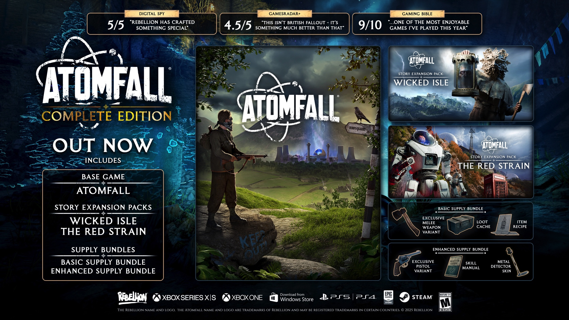 Сегодня Rebellion выпустила Atomfall в полном издании на Xbox Series X|S, PlayStation 5, Windows PC и ПК в Steam и Epic Games Store. Оно включает в себя основную игру, а также два сюжетных дополнения: Wicked Isle и The Red Strain.