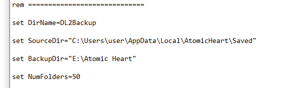 set BackupDir="D:\Files\Загрузки из нета\Atomic_Heart\BackUp"