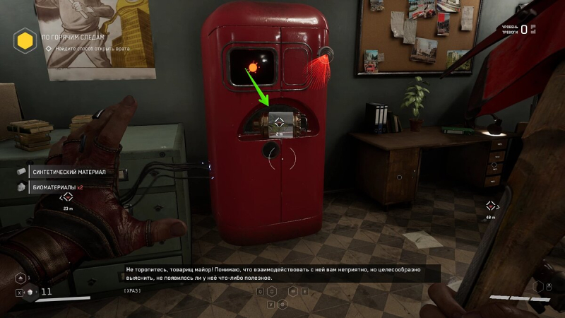 Идите по маркеру и через вентиляцию попадите в следующую комнату. Откройте дверь справа, заберите руку и убейте робота-работника. Вернитесь и откройте большую дверь.