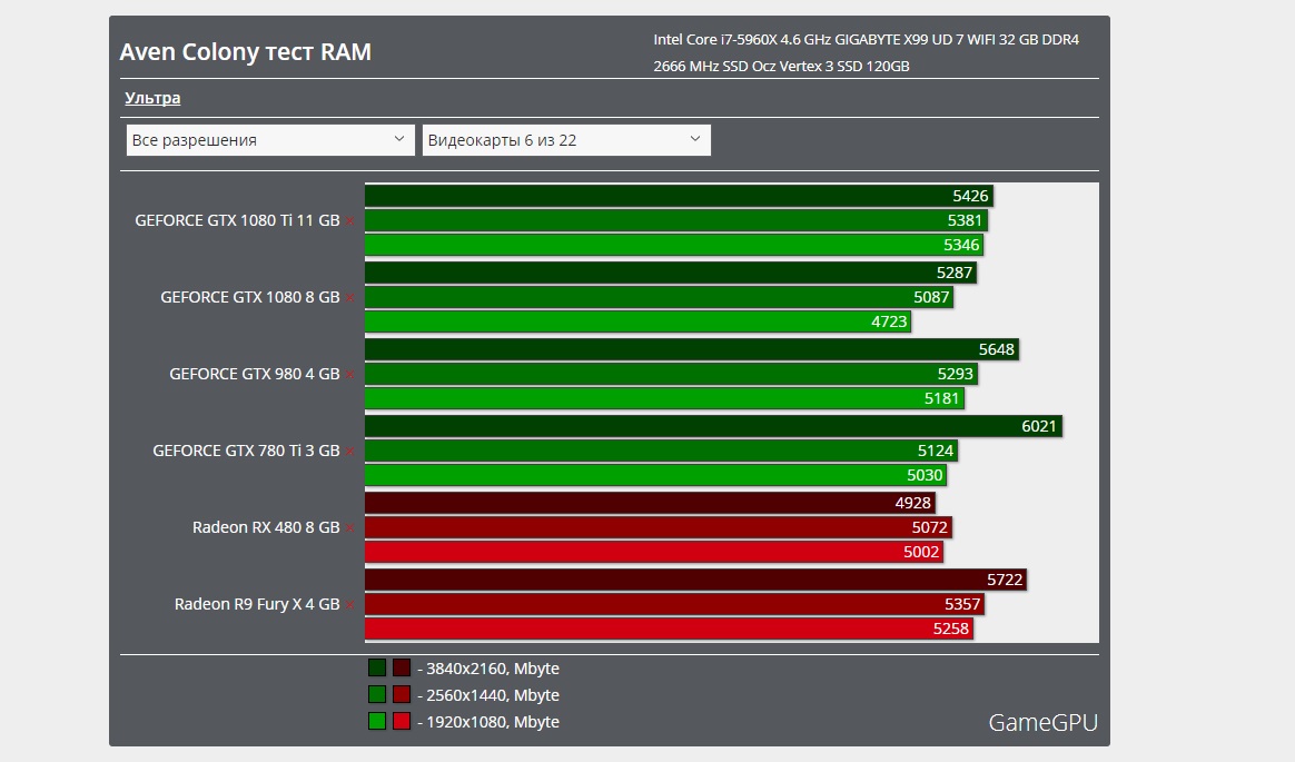 При разрешении 3840х2160 потребление ОЗУ у системы видеокартой с 3-мя гигабайтами набортной памяти составляет 6000 мегабайт, с 4-мя гигабайтами 5700 мегабайт, с 6-ю гигабайтами 5600 мегабайт, с 8-ю гигабайит 5300 мегабайт и с 11-ю гигабайтами 5400 мегабайт.