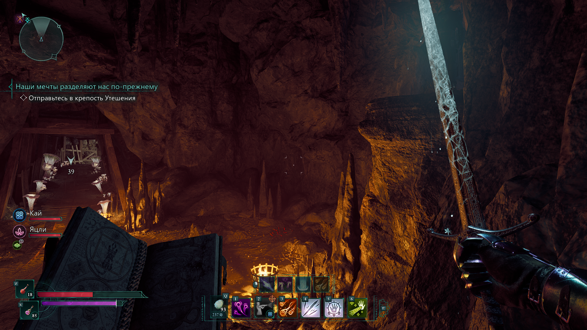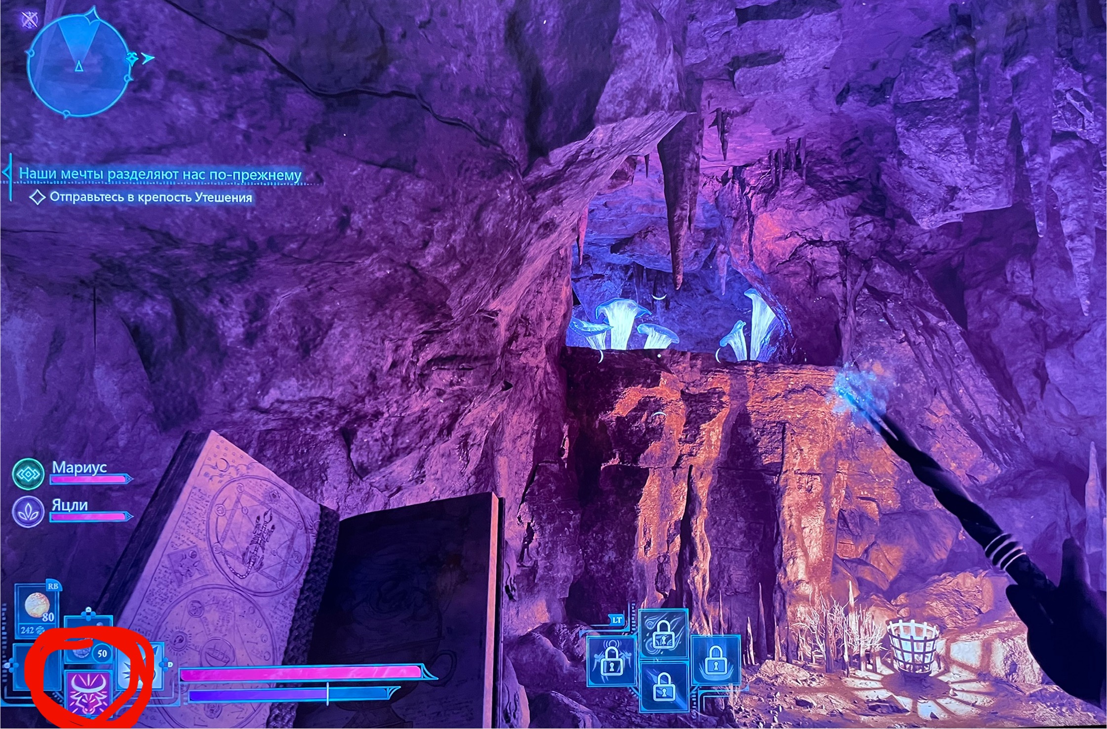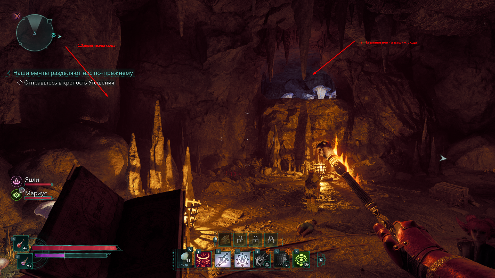 Как только войдете в пещеру слева будут камни, запрыгните на самый высокий, необходим навык «рывок» в ветке боец, вкаченного на 2 ранг, подпрыгиваем на этом камне и юзаем рывок в сторону выступа, персонаж должен зацепиться