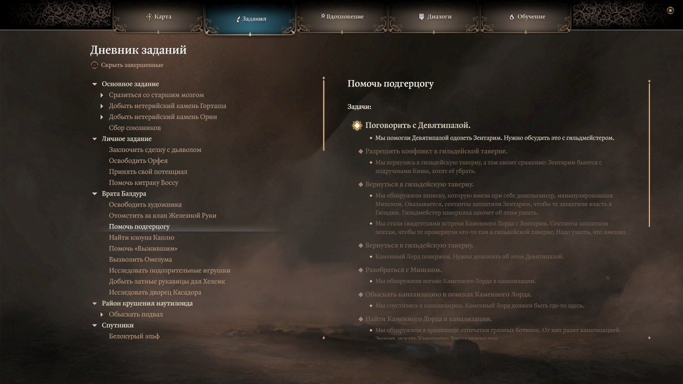Прохожу этот момент. В графе «сбор союзников» отобразилось, что гильдия поможет в трудный час, а вот в «помочь подгерцогу» висит задача «поговорить». И ничего не помогает, подхожу к ней болтать, она шлет меня своими «подожди», «не сейчас», блаблабла. Когда спасла Минска, не взяла его в отряд, но была джахейра. Кстати, не было катсцены перед боем, я зашла со стороны гильдии из кабинета Девятипалой. Переиграла заход, зашла через главный вход в таверну, произошел диалог с Зентарим в этот раз. Но это не решило проблему. Попробую убрать из отряда Джахейру. Не, ничерта на разговаривает и так.