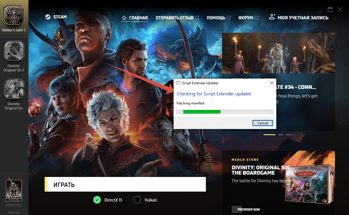 При запуске лаунчера Larian происходит "Checking for Script Extender updates", ранее, до вылета данного окна не видел.