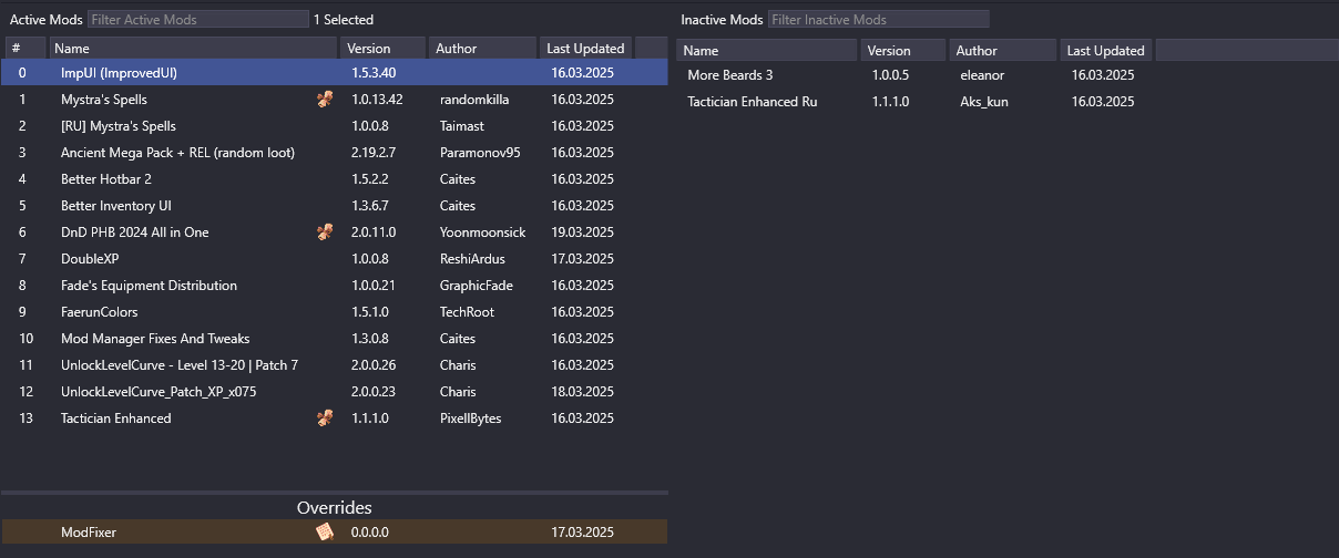 Привет, народ! Такая проблема, играю с другом по сети с модами, но по прошествии некоторого времени игра вылетает после удара. Забавное примечание, это происходит после того, как ударю именно Я. Старались исправить порядок модов, ставили ImpUI (где-то слышал, что он должен стоять в самом верху) самым первым в списке, но порядок всегда перемешивался после перезахода во внутреннем мод менеджере. Даже создали новую игру, где по-началу все было очень хорошо, игра не вылетала, но после паладинов (что охотились на Карлах в 1-ом акте), снова началась карусель с вылетами. Вот и не выдержал и написал сюда, вдруг поможет кто. Видел похожую тему на Playground-е, но решил создать новую, вдруг решение нашли. Модов относительно немного (ниже прилагаю скрин всех модов), может быть какой-нибудь из этих модов и крашит игру.