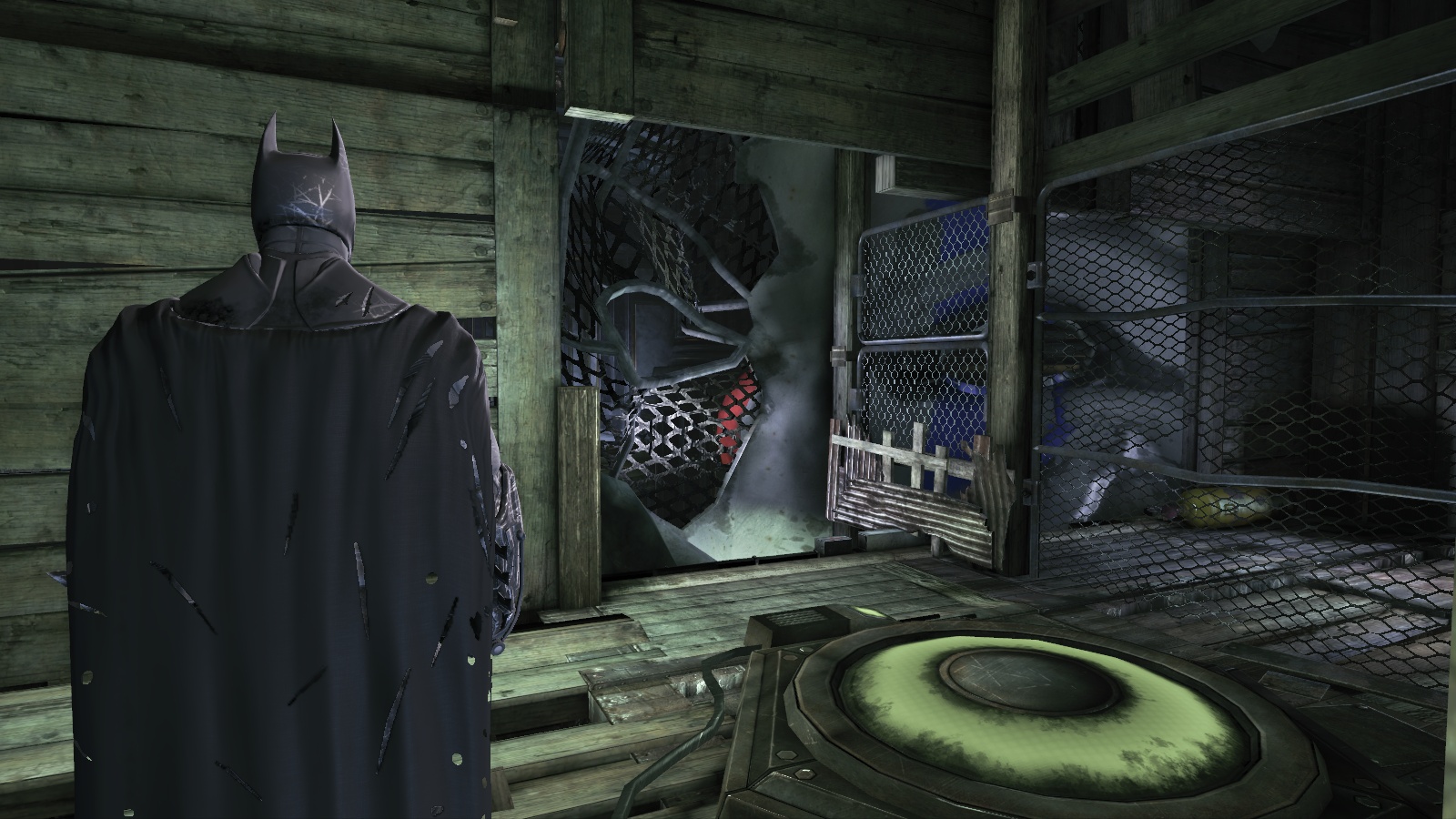 после нажатия кнопки через первый глаз должны начать бить молнии, управляемым бэтарангом заряжаешься, пролетаешь обратно через другой глаз и бьешь в коробку распределения тока. Вроде так.