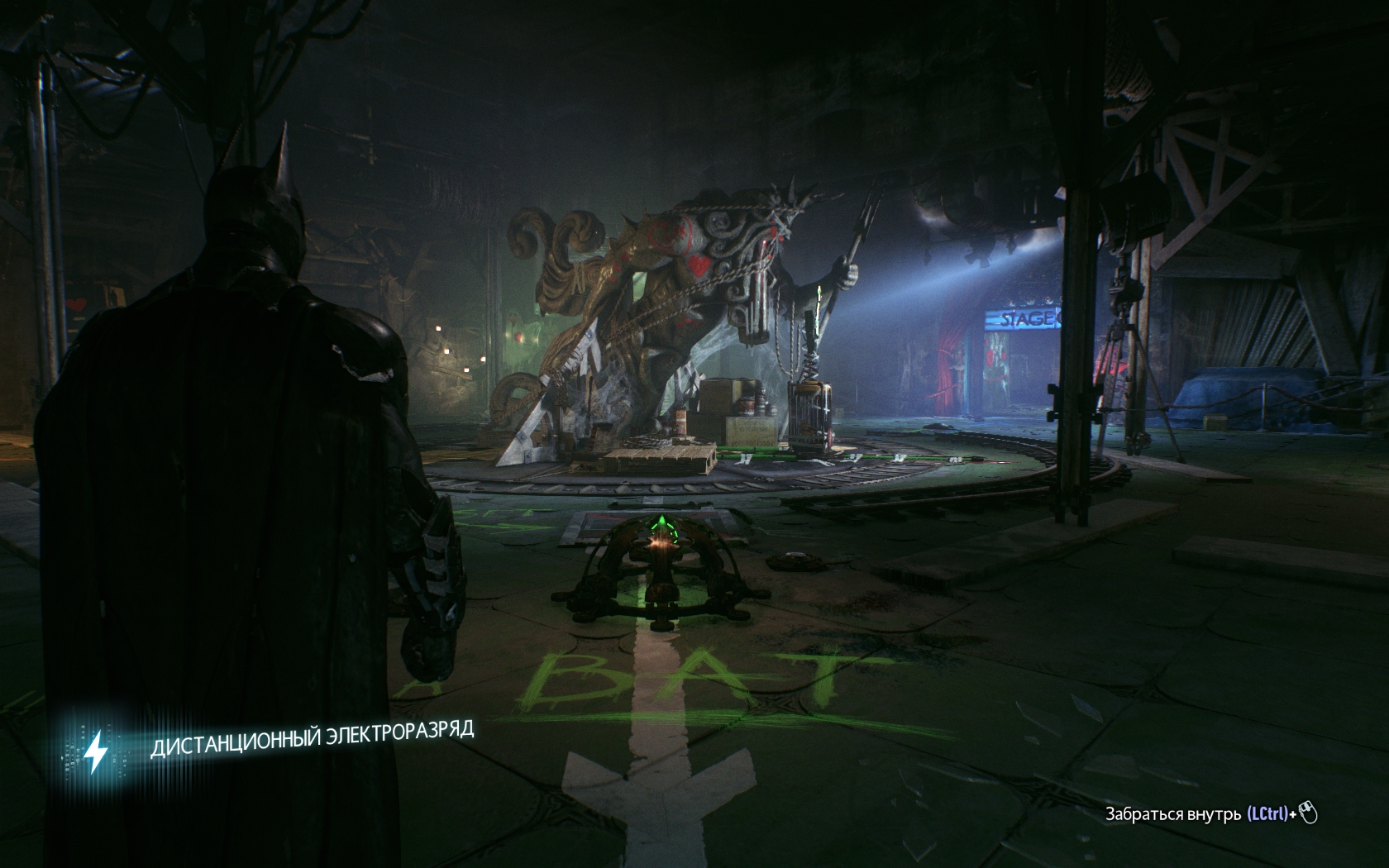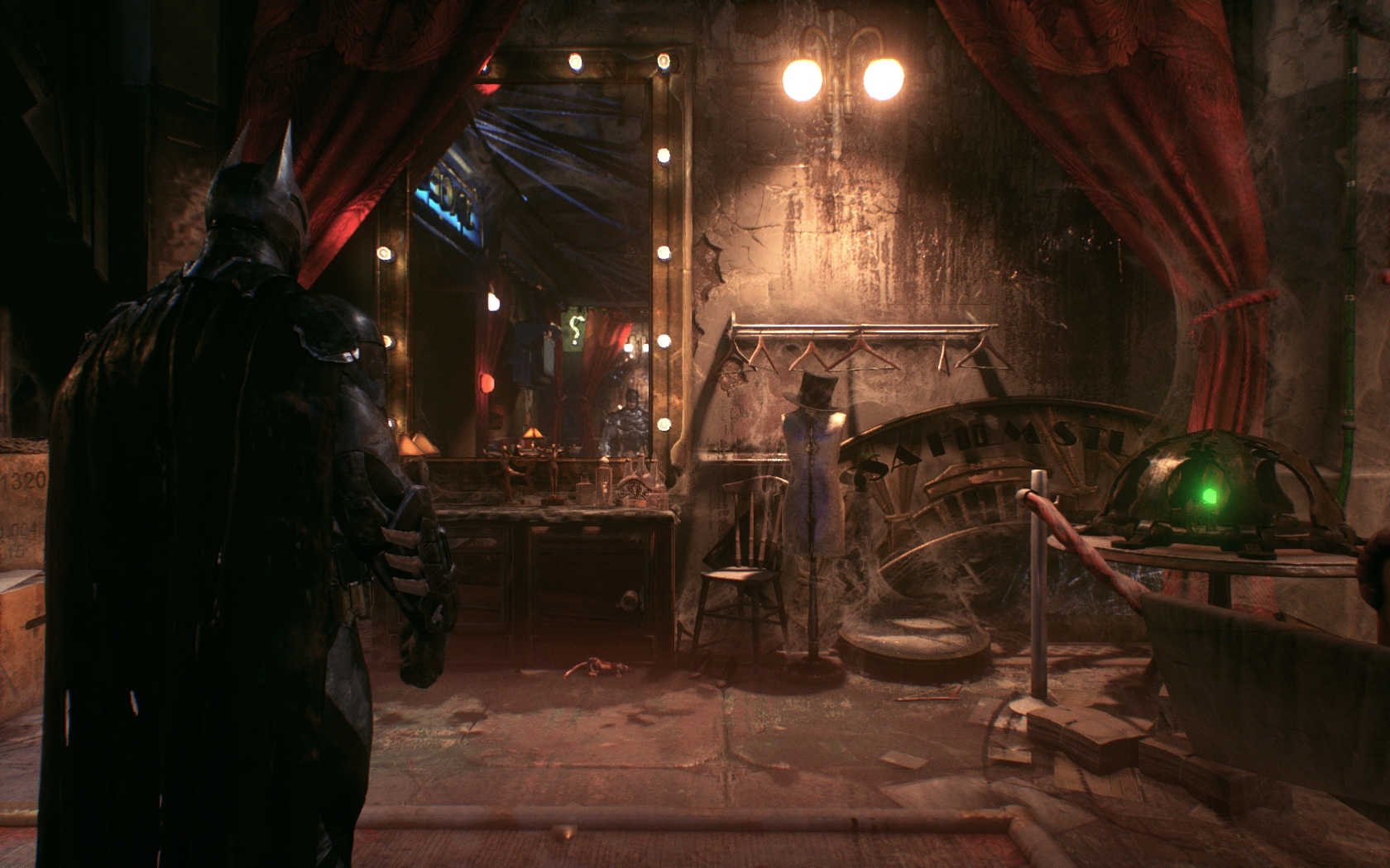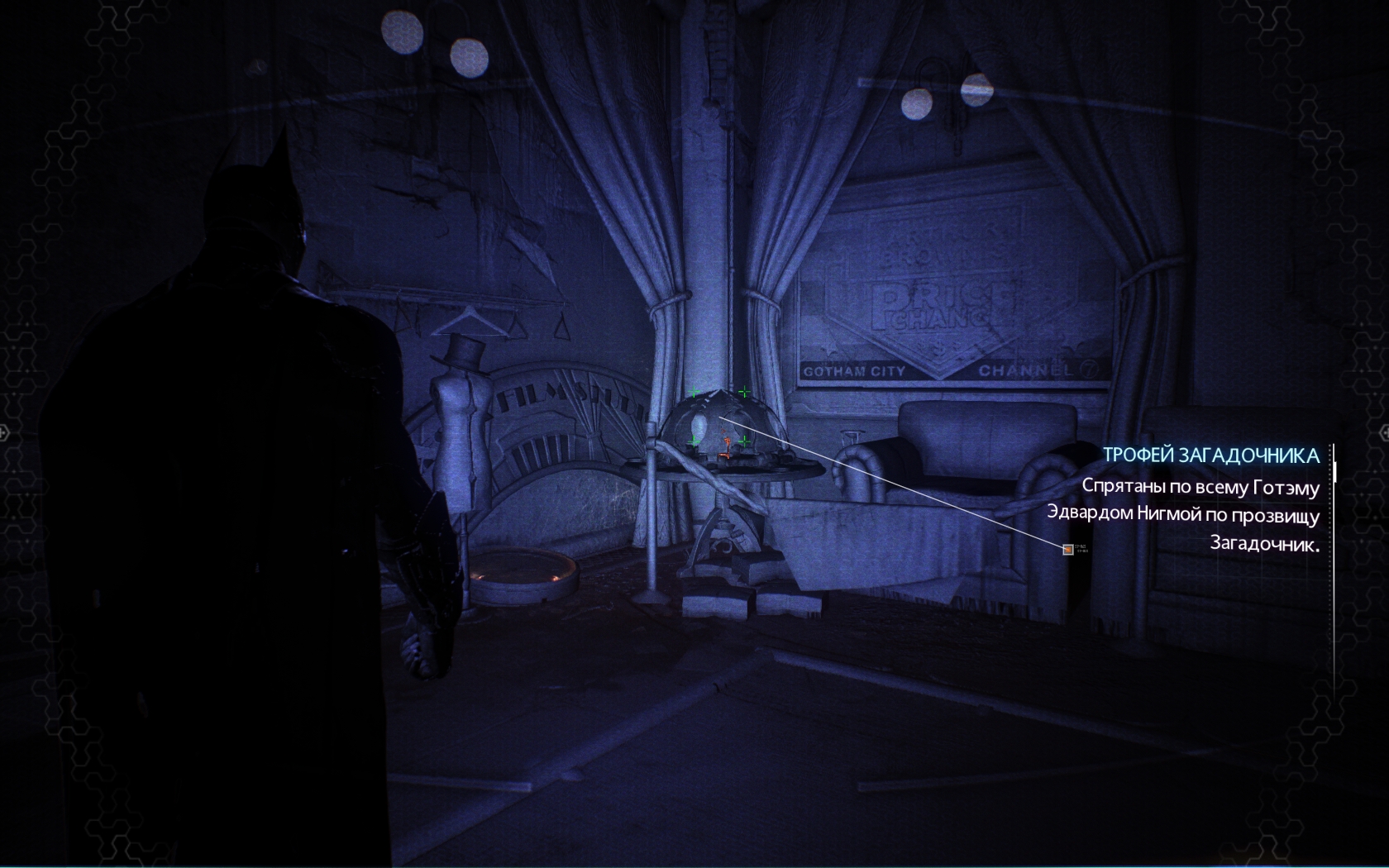 Зайди в другую комнату(там где был Харизма) и брось управляемый бетранг через вентиляцию (там где Робин проходил) и когда прилетит в комнату с зеркалом, то над вентиляцией будет вопросительный знак, попадаешь в него и откроется трофей. На этом скриншоте виден этот вопросительный знак (в зеркале).