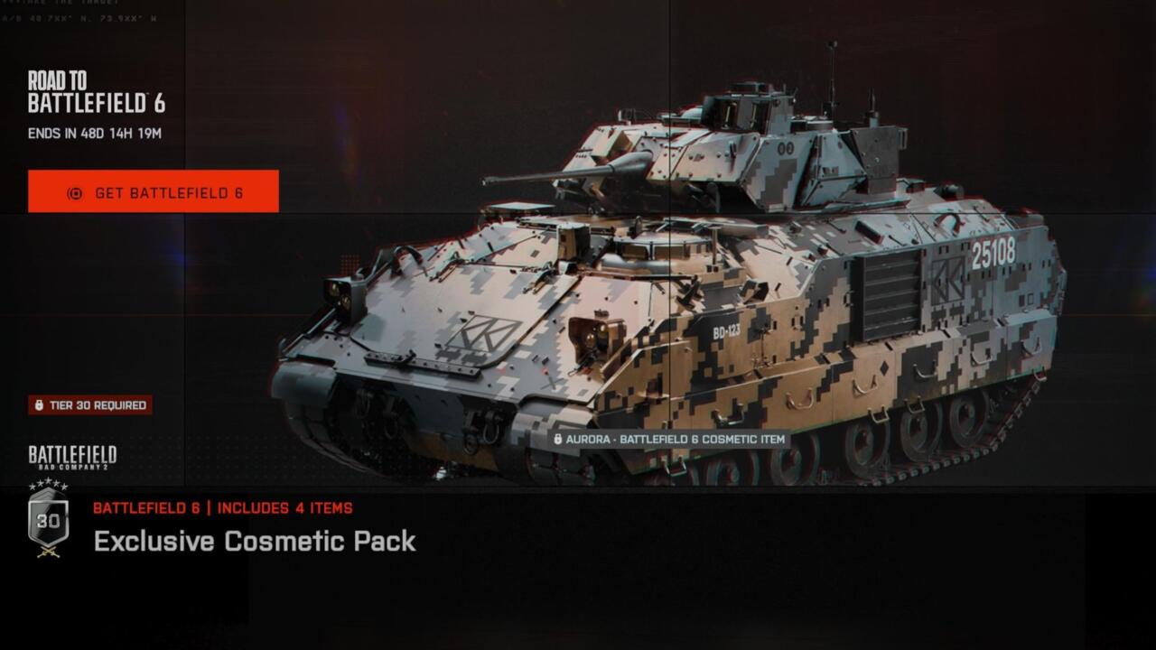 - Уровень 30: Косметический набор из четырех предметов, включающий облик для техники «Аврора».