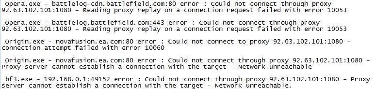 Здравствуйте! У меня на всю сеть один IP адрес. Предположительно из-за этого я не могу играть по Интернету в Battlefield 3 (ошибка "no packet flow"). Я попробовал играть через прокси. Взял в интернет-магазине для ознакомления (бесплатно) прокси socks 5. Загнал все данные в Proxifier. Но при присоединении к серверу игры Proxifier выдаёт ошибки (на картинке).