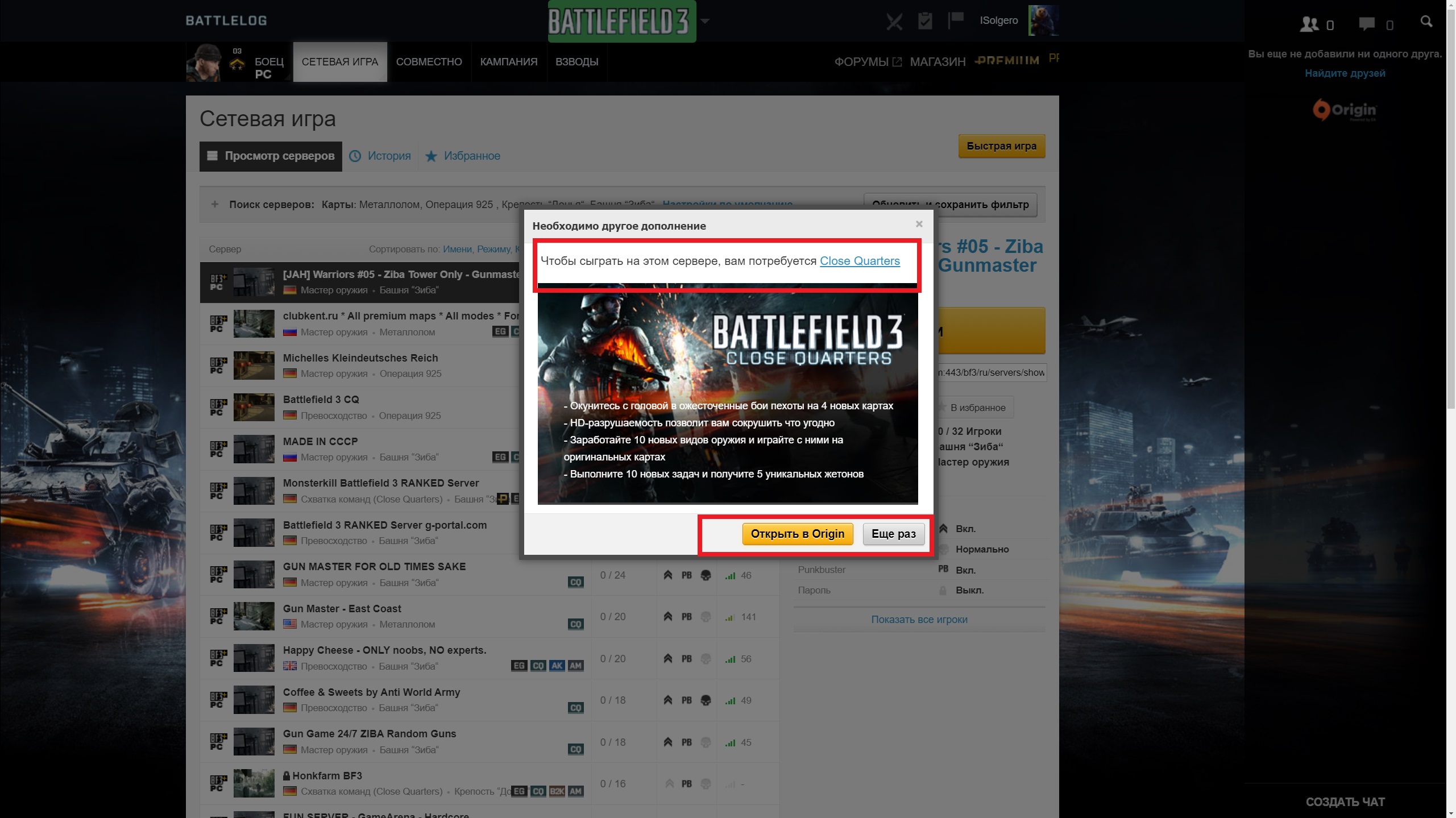 Нажимаю играть в steam - запускается origin - открывается сайт battlelog - фильтрую по картам из close quarters - нажимаю присоединиться на единственный не пустой немецкий сервер - пишет что нужно dlc