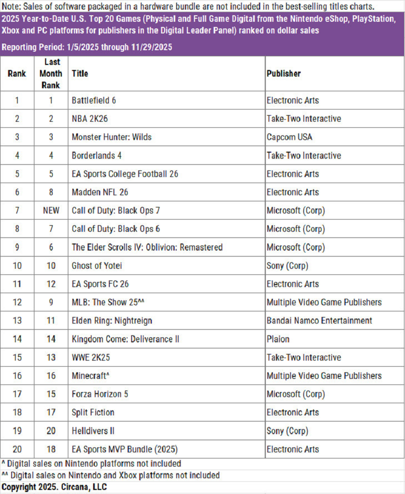 Согласно последним данным, собранным в период с 5 января по 29 ноября, Battlefield 6 – самая продаваемая игра в США в 2026 году как в цифровом, так и в физическом формате. Что касается ее главного конкурента, Call of Duty: Black Ops 7, то она заняла 7-е место, ранее принадлежавшее Call of Duty: Black Ops 6.