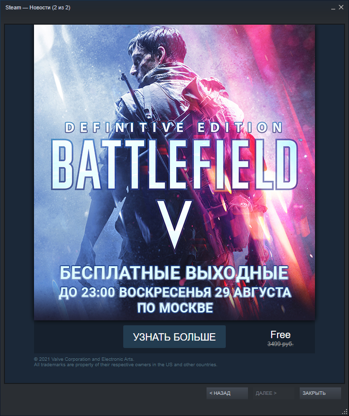 Последняя на данный момент часть серии, Battlefield V, может быть доступна бесплатно с завтрашнего дня. Эта информация появилась в SteamDB. Издатель игры и Valve пока не подтвердили эти сообщения. Согласно информации, Battlefield V будет доступна бесплатно с завтрашнего дня, 26 августа, в 20:00 по московскому времени.