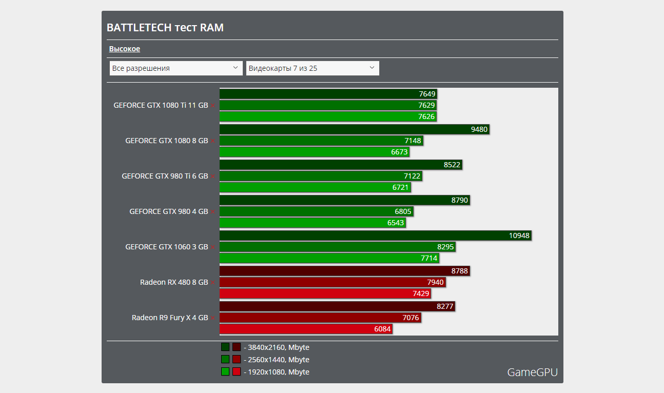 При разрешении 3840х2160 потребление видеопамяти у видеокарт с 3-мя гигабайтами набортной памяти составляет 3000 мегабайт, с 4-мя гигабайтами 4000 мегабайт, с 6-ю гигабайтами 5000 мегабайт, с 8-ю гигабайит 5000 мегабайт и с 11-ю гигабайтами 5100 мегабайт.