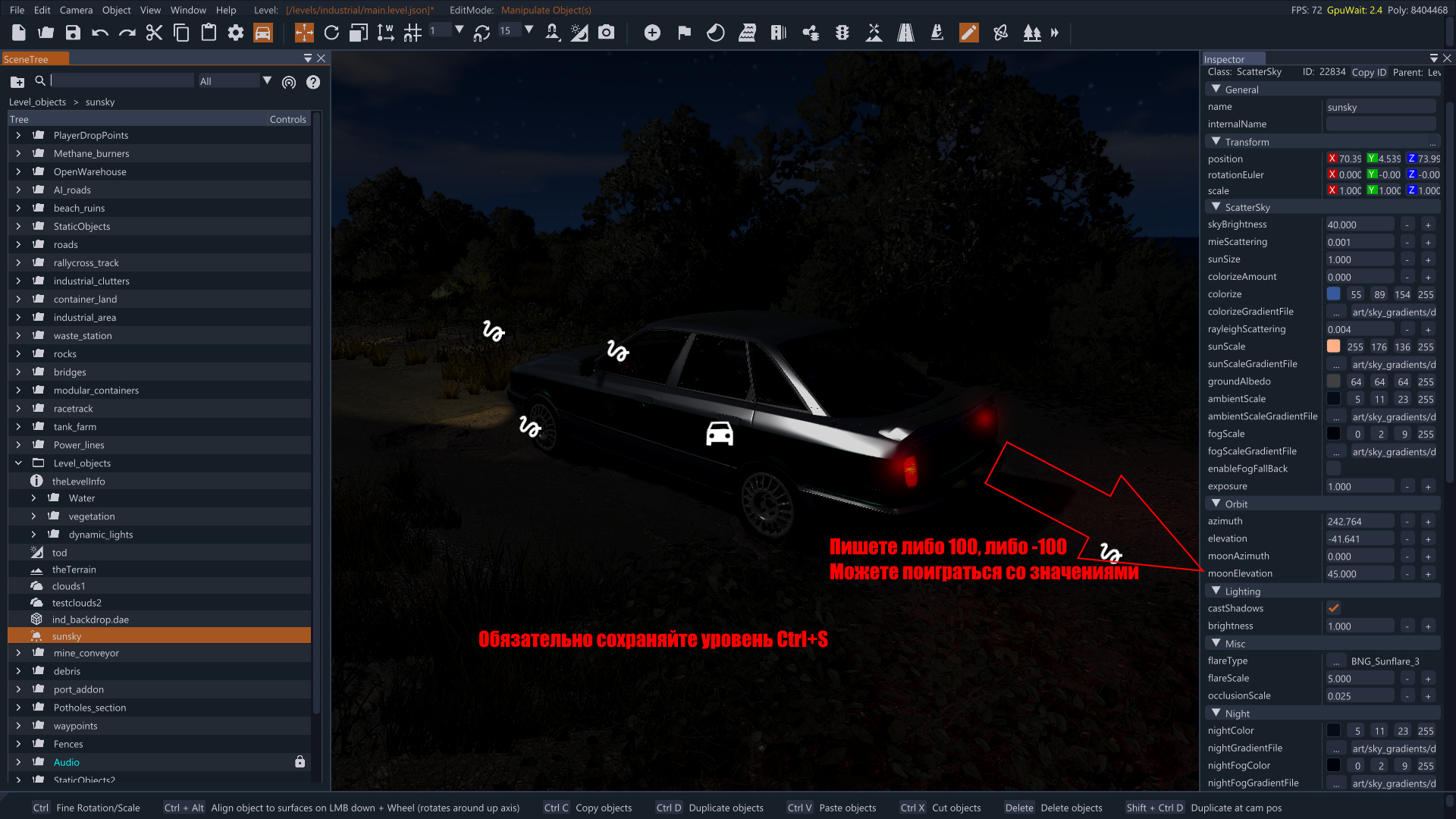 Если Вас беспокоит слишком яркий свет луны с одной из сторон, не важно, готовая карта или ваша созданная, нужно поменять всего 1 значение в «sunsky», а именно «MoonElevation». Можно поставить 100, и луна будет светить почти ровно сверху, и не будет засветов камеры в любом направлении. Либо же поставить -100, и тогда луна уйдет под землю, но, как я понял, свет от неё слегка отражается на машине, однако ночь становится еще темнее и атмосфернее.