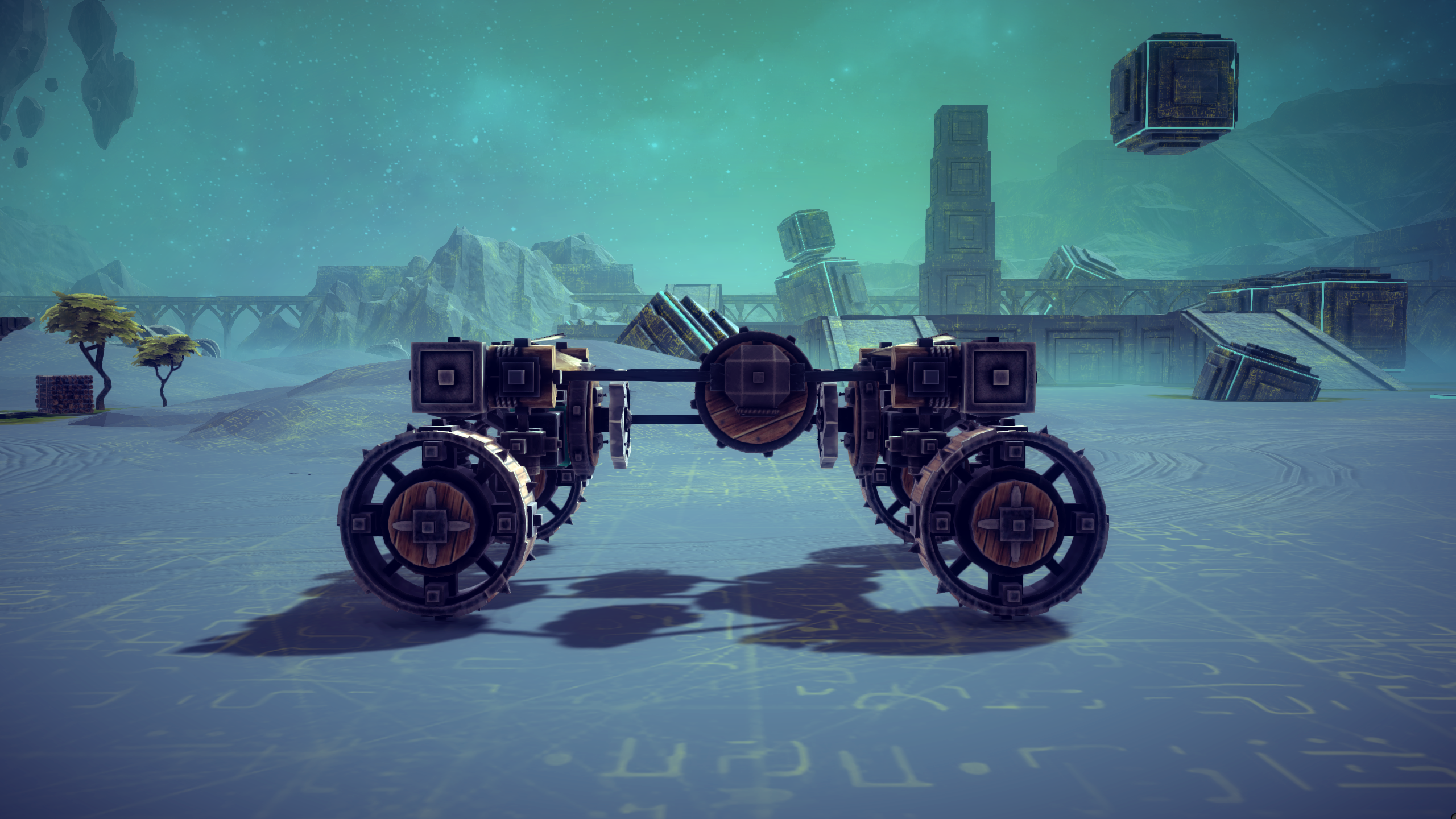 Одна из ранних работ которую я только решил выложить, сделана на версии 0045 еще в 2017 году когда не было функции "Авто-возврат" у блоков "Рулевой шарнир" и "Рулевой блок" а добавлялся такой функционал только через мод а без модов нужно было использовать поршни и выдумывать механизмы для комфортного управления в добавок есть гиродины во всех направлениях которые и машину перевернут и на подъемке помогут и пара летных блоков которые прижимают вездеход что дает шикарную проходимость что позволяет вскарабкаться практически куда угодно.