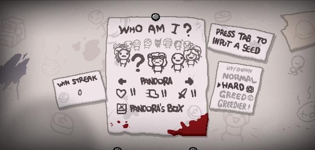 Pandora начинается с активного элемента ящик Пандоры, ущерб множитель 1,2, базовой скорости 1.3, но имеет только 2 сердца.