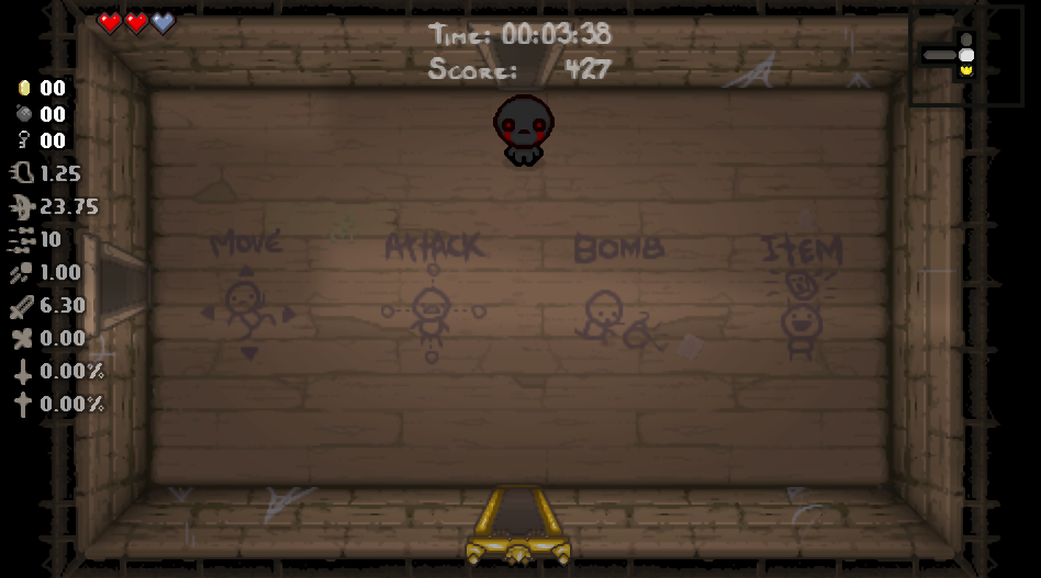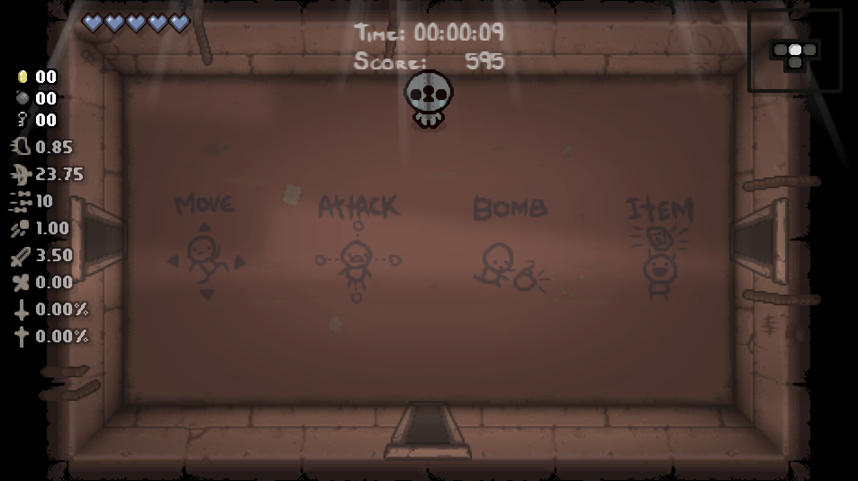 Персонаж имеет 5 синих сердец, 3.50 ед. урона, 0.85 ед. скорости передвижения, может получать красные сердца, не имеет артефактов с начала игры.