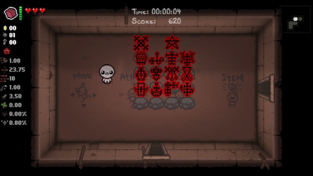 - Asmodeus: повреждение врагов увеличивает удачу для остальной части комнаты. Айзек невосприимчив к ползучести, огню, взрывам, шипам и красным какашкам. + 0,5 скорости вверх.