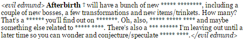 <злой эдмунд> В Afterbirth+ будет много новых ***** *******, включая несколько новых боссов, несколько трансформаций и новых предметов/брелоков. Сколько? Эту ****** вы найдете на ***** ****. О, также ***** ***** **** и может быть что-то еще, связанное с ***** ****. Также *** ****** я оставлю до более позднего времени, чтобы вы строили догадки, гипотезы ***** ****.</злой эдмунд>