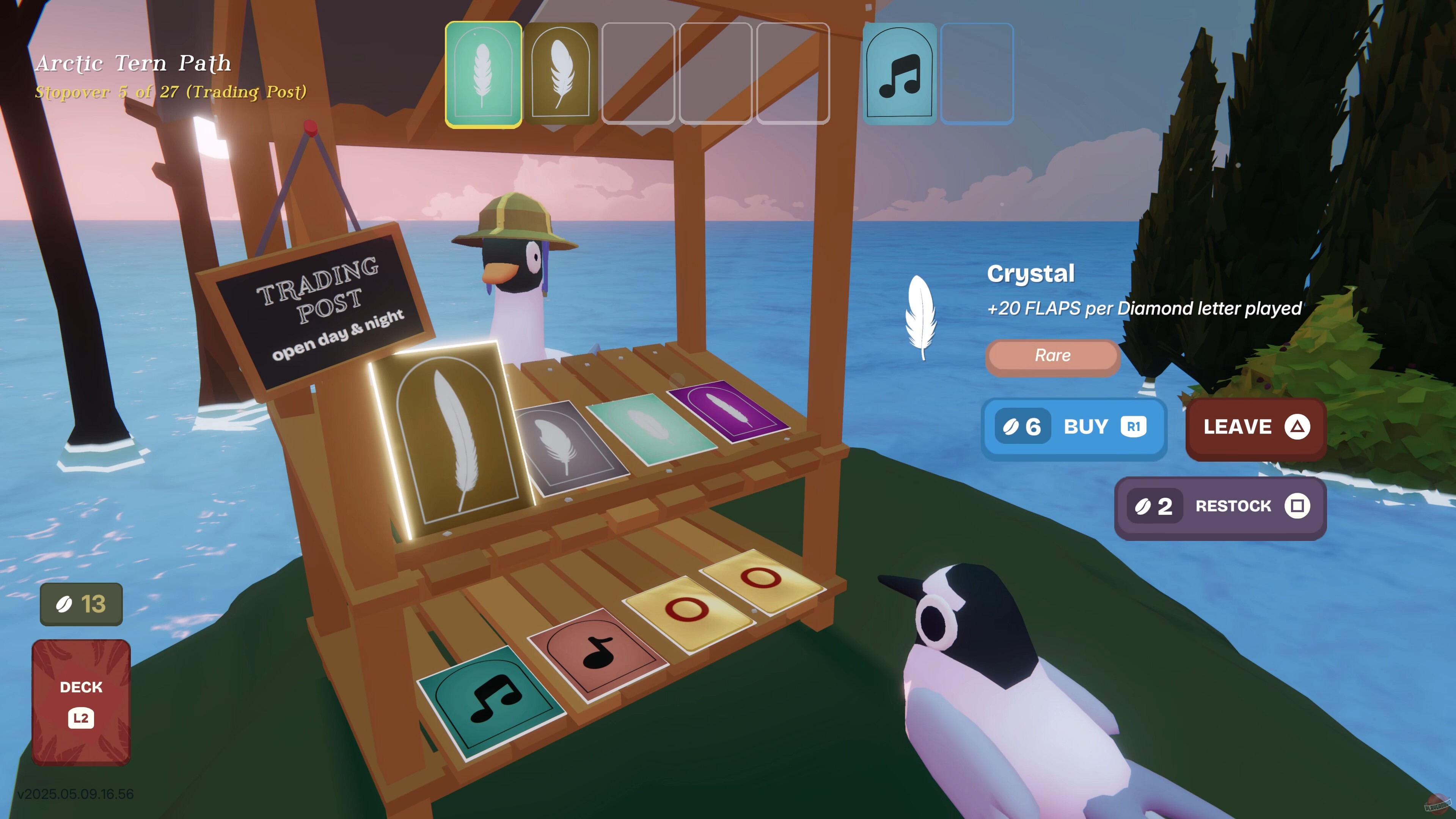 Словесная игра с элементами колодостроения, где вы управляете стаей птиц во время их миграции. Основная механика довольно простая: берёте карты с буквами, складываете из них слова, получаете очки. Длинные слова дают больше баллов, но есть специальные комбинации, которые могут сделать эффективными даже короткие слова. Если рука не нравится — можно сбросить до четырёх карт за раунд и попробовать вытянуть что-то получше. Также можно улучшать свою колоду, добавляя усиленные буквы и убирая сложные.