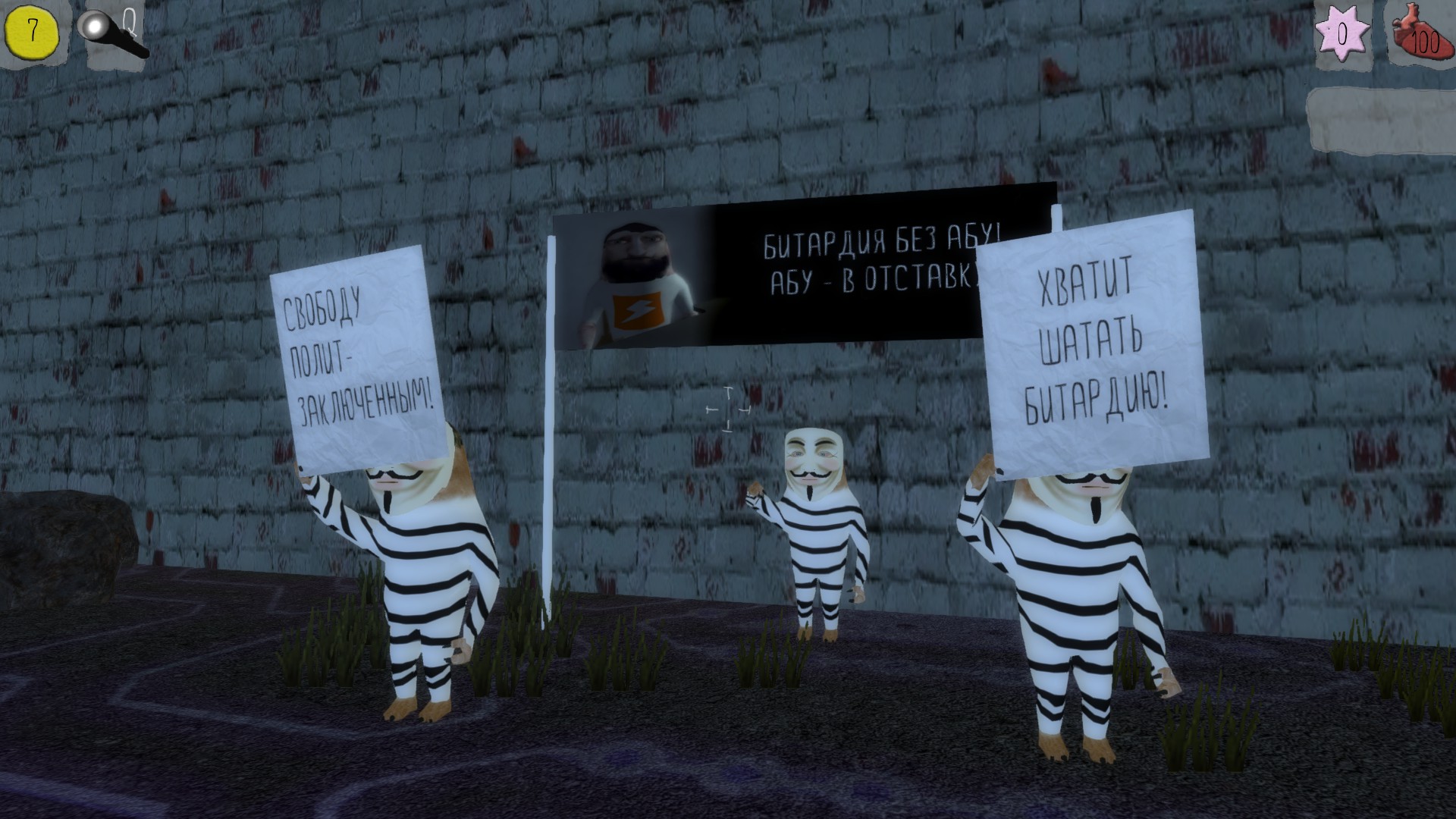 Так что самое прибыльное дело в Битардии (если не использовать читы) — квесты. Есть и побочные, и основные. Но их, во-первых, мало, а во-вторых, они работают через одно место. Если работают вообще. Иногда это задания со странной логикой, иногда — копии других игр. Можно встретить Пирамидоголового , который отведет вас в ночной парк, огороженный забором без дверей, и попросит собрать 8 потерянных записок. На самом деле это такой Slender среди трех сосен, капища, обломка стены и горящих автомобилей, где эти самые листовки почему-то прибиты к деревьям. Зато сразу 100 лулзов в карман. Можно пойти в магазин Габена и купить себе шапочку из фольги или шокер, а затем устроиться сторожем, чья работа — ничего не делать (лулзов тоже не будет, только деньги зря потратишь — но в этом мудрые люди тоже, наверное, могут рассмотреть сакральный смысл).