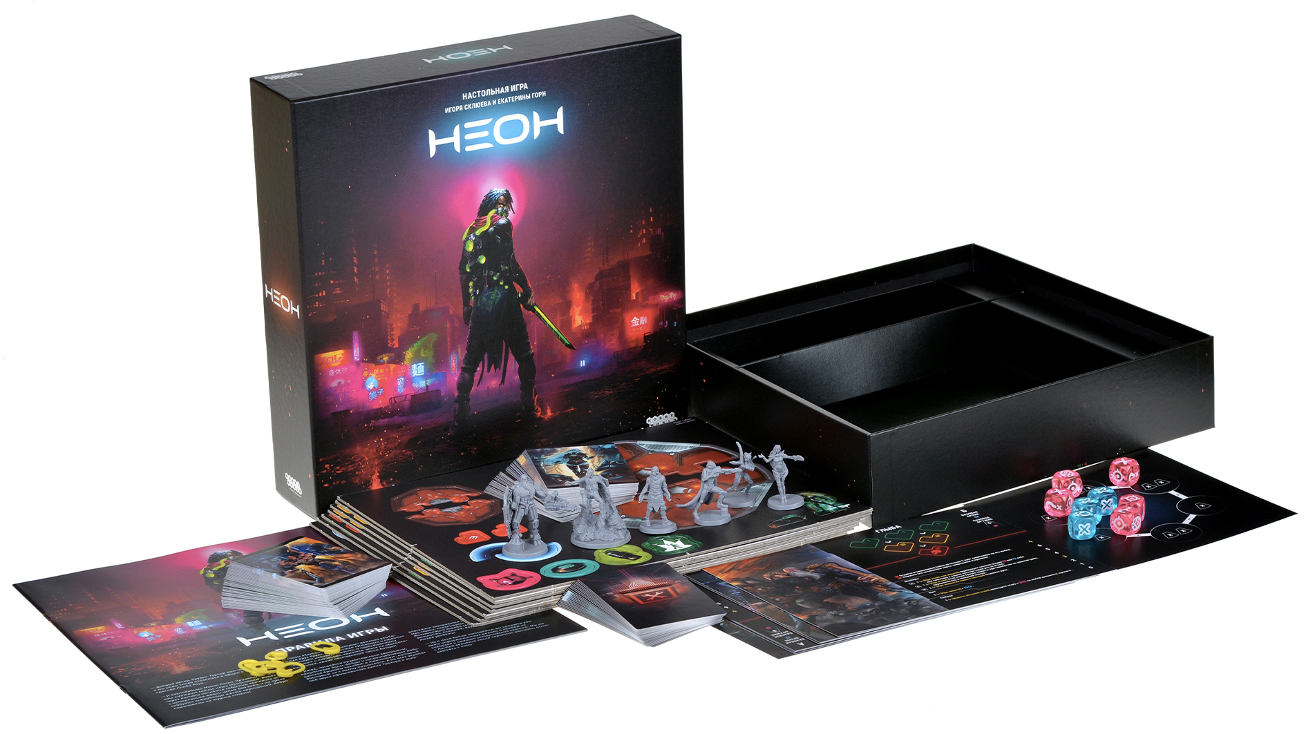 Подробнее"Неон" – это настольная игра в жанре киберпанк, основанная на механике "королевской битвы". Во время игры поле будет постепенно уменьшаться, вынуждая оппонентов приближаться друг к другу, идти на риск и принимать ответственные решения прямо на ходу. Вы будете перемещаться по районам Нео-Нагои, собирать новые виды оружия и брони, планировать действия и перемещения.