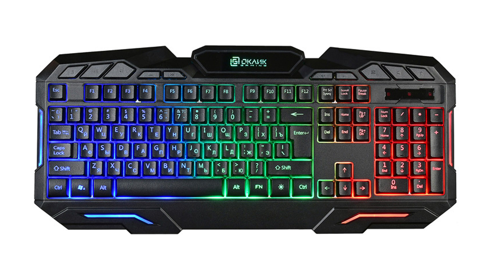 Клавиатура OKLICK 700G Dynasty обладает полноформатной 104-клавишной QWERTY-раскладкой. Для быстрого цифрового набора присутствует блок NumPad, а для доступа к медиа-функциям есть 12 мультимедийных клавиш. «Агрессивный» дизайн клавиатуры подчёркивает её геймерское назначение. Каждая из клавиш имеет многоцветную подсветку, с возможностью изменять её режим и яркость.