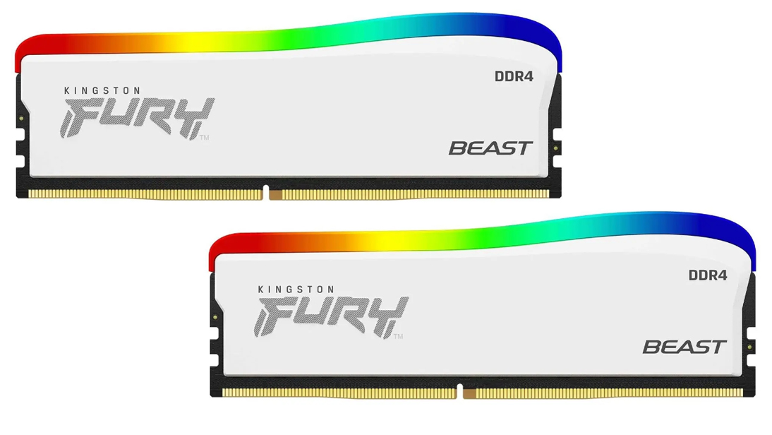 Набор из двух планок оперативной памяти DDR4 Kingston FURY Beast по 8Гб каждая. Версия RGB Special Edition обладает прозрачной вставкой в верхней части радиатора, под которой расположены программируемые светодиоды.