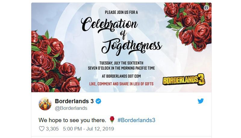 Вчера на официальной странице разработчика Borderlands 3 Gearbox Software в твиттере появилось открытое приглашение игроков на некое мероприятие, названное «Праздником Единения» (Celebration of Togetherness). Праздник начнется на сайте Gearbox 16 июля в 18 часов (МСК).
