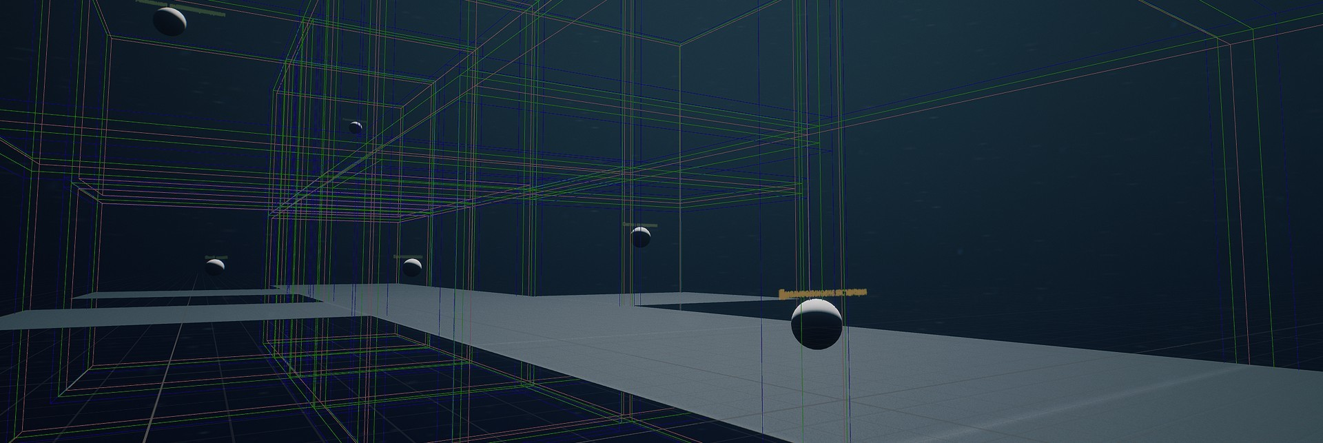 5. И, разумеется, прямо сейчас, на наших рабочих версиях движка, можно оценить более тысячи километров красивейших космических пейзажей (на картинке ниже не забудьте представить себе более тысячи километров красивейших космических пейзажей). Ладно, признаемся, без сценария локации собирать не имело никакого смысла, поэтому там сейчас шарики, подписи и базовые механики отработаны.