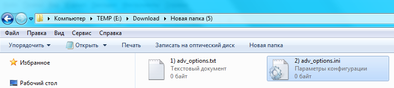 Он создан правильно? - чтобы ОС "понимала" файл, у него должно быть правильное расширение (они скрыты по умолчанию). Если создать обычный текстовик с названием "adv_options.ini", он автоматически не станет системным файлом .ini, а будет читаться виндой как "adv_options.ini.txt". Для полного переименования нужно предварительно снять галочку...